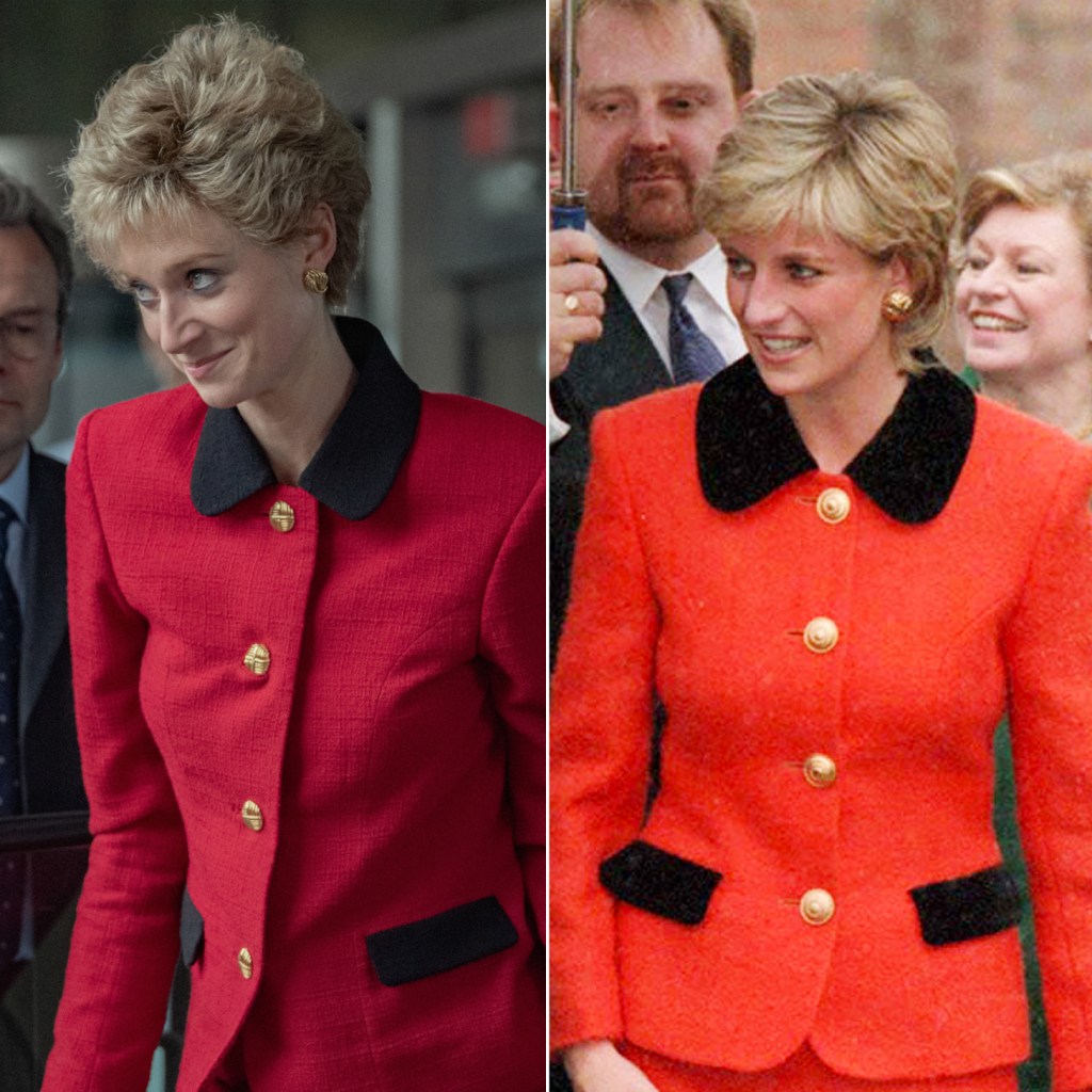 It seems “The Crown” based Debicki’s costume in that scene on a real jacket Diana was often photographed wearing in the ’90s. In this picture from 1995, she wore it to visit the English National Ballet School. The photo also gives a good idea of how Diana was swamped by crowds during public events, just like in the show.