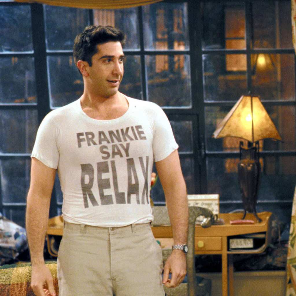 How amazing is this too-small-for-comfort “Frankie Say Relax” tee that Ross wears to prove a point to Rachel?