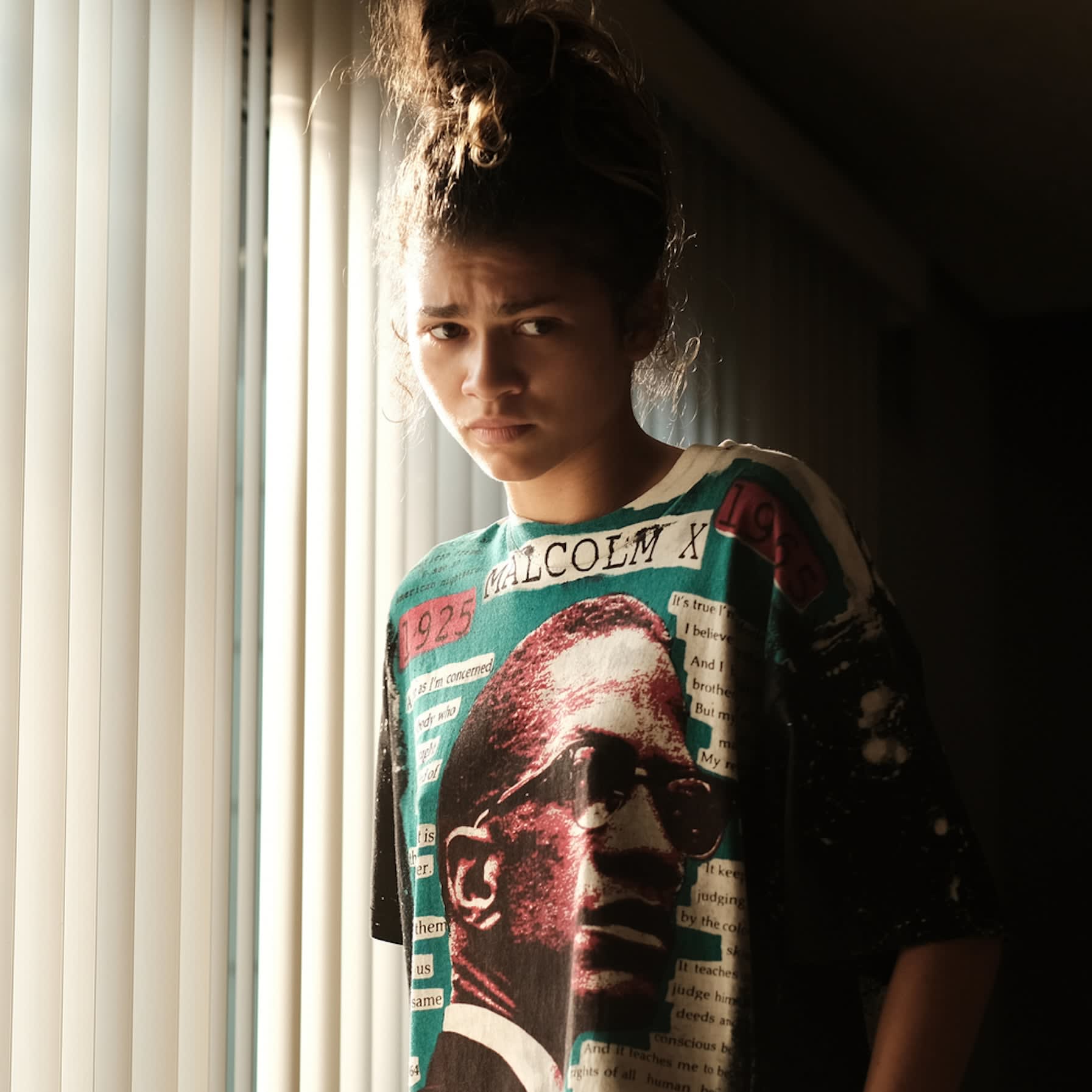 Fast-forward to episode six of season two, and Rue – who’s experiencing some serious opiate withdrawals after her trip to Laurie’s – calls Ali on the phone to apologise for using his past parenting missteps against him. During the tense and moving chat, she wears baggy sweatpants and the vintage T-shirt with Malcolm X’s face and quotes plastered on the front. It seems “Euphoria” costume designer Heidi Bivens chose to dress Rue in the eye-catching piece as an indication that she’s been taking Ali’s advice to heart and that her apology is (hopefully) the first step on a long road to recovery ahead – her own personal revolution, if you will. Symbolism and character growth – we love to see it.