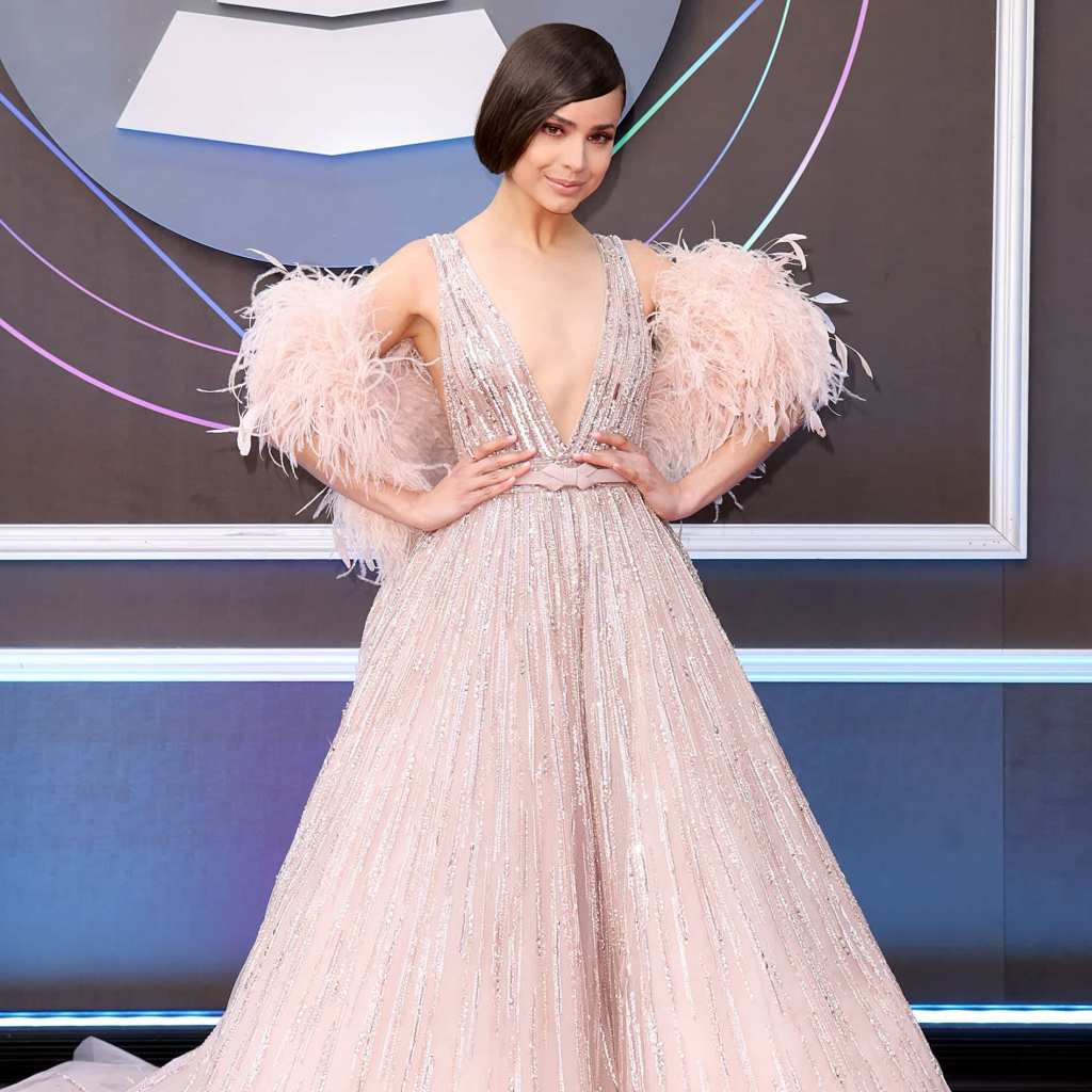 Someone get Sofia Carson a tiara, because it’s all that’s missing from her princess look. On Thursday night, the actress and singer pulled out all the stops at the Latin Grammys, wearing a stunning light-pink Zuhair Murad Couture gown while posing for photos on the red carpet. Her blush-pink dress was adorned with silver sequins dripping throughout, and a quaint bow wrapped around her waist pulled the whole regal look together. Sofia was oozing elegance as she had a feathery shawl draped over her shoulders.