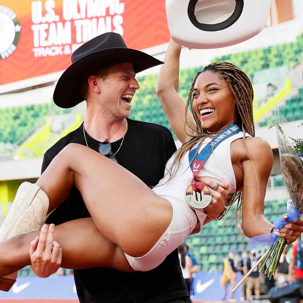It turns out the couple that trains together really does stay together because Tara Davis and longtime boyfriend Hunter Woodhall are officially engaged! The happy couple shared the announcement in joint Instagram posts on Sept. 26, which included photos of Hunter proposing to Tara on the beach in Cabo San Lucas. “You’ve showed me the true meaning of life and now i get to spend the rest of my life with you. [sic] let me reintroduce myself as a FIANCÉ,” Tara captioned the photos on Instagram.