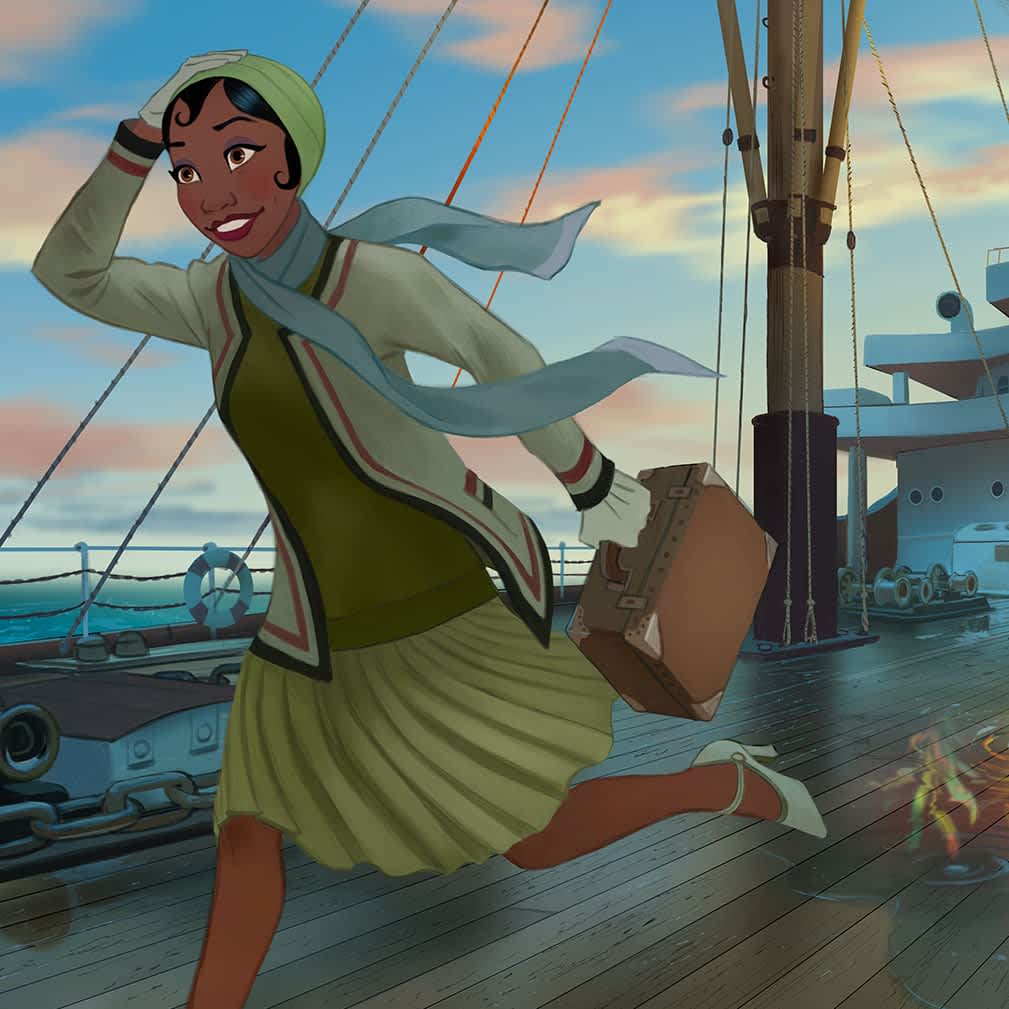 A first look at the concept art shows Tiana aboard a ship, suitcase in hand. Where is she going? Disney alluded that she is setting off for “a grand adventure” as the newly crowned Princess of Maldonia, but a calling to her native New Orleans past isn’t far behind.