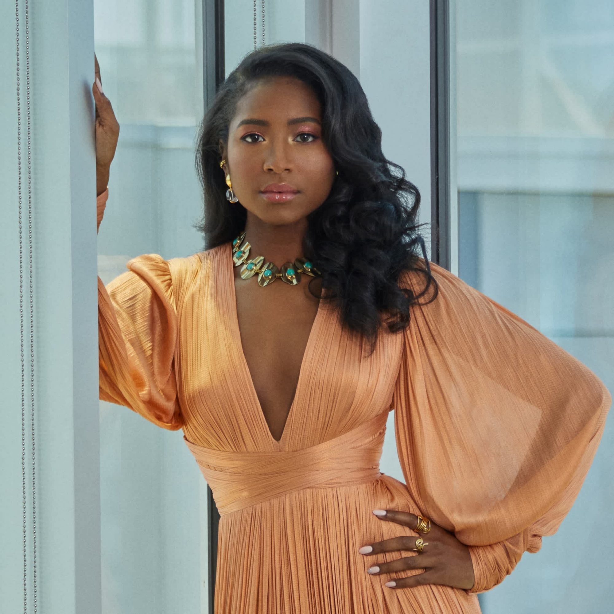 Outside of acting, Grant is “an avid reader,” mostly of self-help books and memoirs, and also thoroughly enjoys meditating, spirituality, and giving back to the Caribbean island community. Her hectic filming schedule didn’t allow for much downtime to meditate, but she found a workaround to help her stay zen. “Sometimes when I have too much going on, it’s harder for me to get quiet and to get filled,” she said. “However, what did help me was listening to music.” She curated an entire Cleo-inspired playlist that she’d jam to while getting ready for scenes, filled with Caribbean artists like Jamaican DJ Popcaan, Trinidadian singer Machel Montano, Jamaican singer Mavado, and, of course, Barbadian icon Rihanna. “It would just get me in the zone and in the mood,” she said, adding that she created playlists inspired by her previous roles.