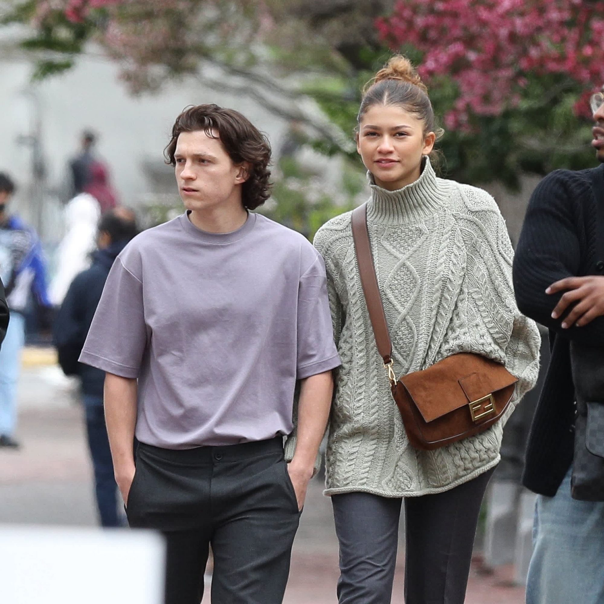 Zendaya and Tom Holland may keep their romance mostly under wraps, but they showed off some subtle PDA while photographed around Boston. The pair were spotted holding hands, taking a casual stroll, and sightseeing together in the city on April 24. Zendaya wore an oversized pale green turtleneck sweater with grey pants and white Nike sneakers, while Holland opted for a simple grey shirt, black trousers, and matching sneakers.