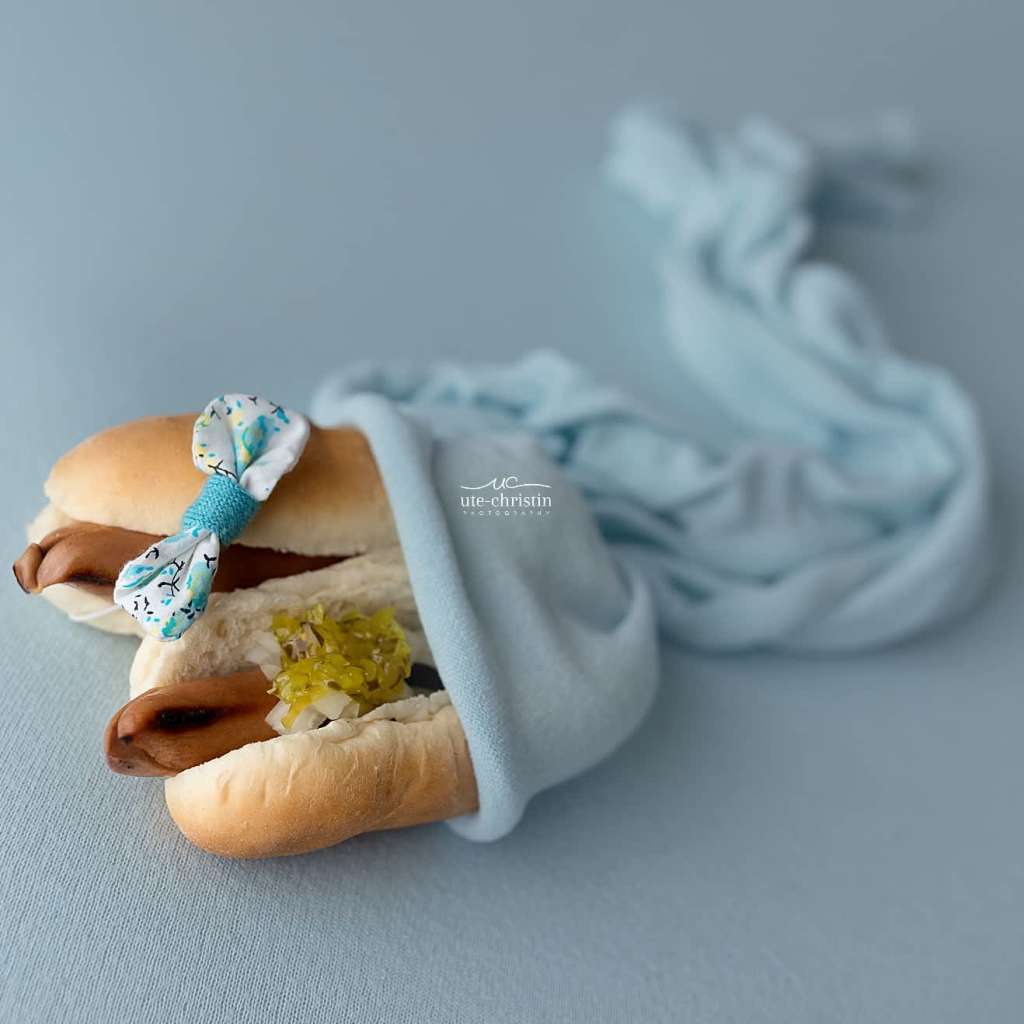 So, she set to work taking portraits of everything from pepperoni pizza to a half-dozen bagels to iced coffee to french fries and fizzy soda – but with an adorable spin that only someone who works with an under-1-month-old client base and a studio filled with pastel props could achieve. She added swaddling blankets around relish-topped hot dogs (talk about giving “pigs in a blanket” new meaning!) and topped a gooey grilled cheese sandwich with a tiny gold crown. She set chips and salsa atop cozy yarn!