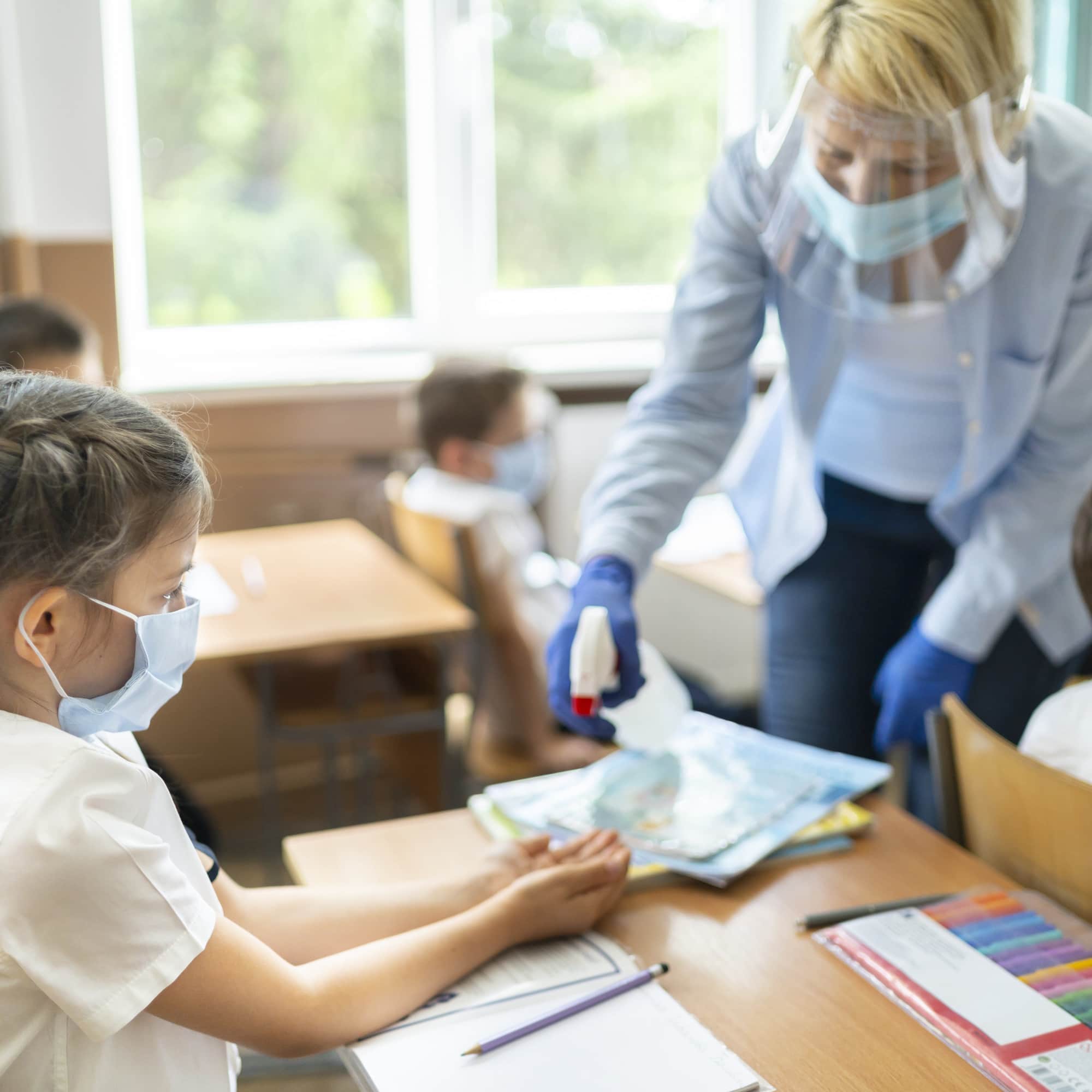 5. Physical distancing at all times. She said these protocols should be in place “both indoors – with spaced-out desks – and outdoors during breaks and physical education,” she said. “Eliminate the need to share materials or supplies. If necessary, disinfect often.”