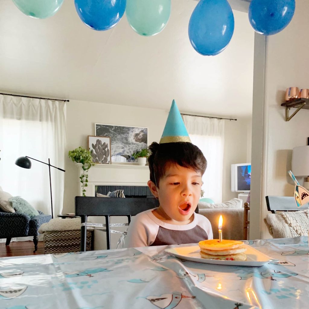 The next morning, we woke up to the sound of the birthday boy giggling and swatting the balloons we had piled in the small hallway outside of his door. When my husband, baby son, and I made our way into the dining room, our 4-year-old’s eyes went straight to the shark-themed birthday table setting, and he lit up.