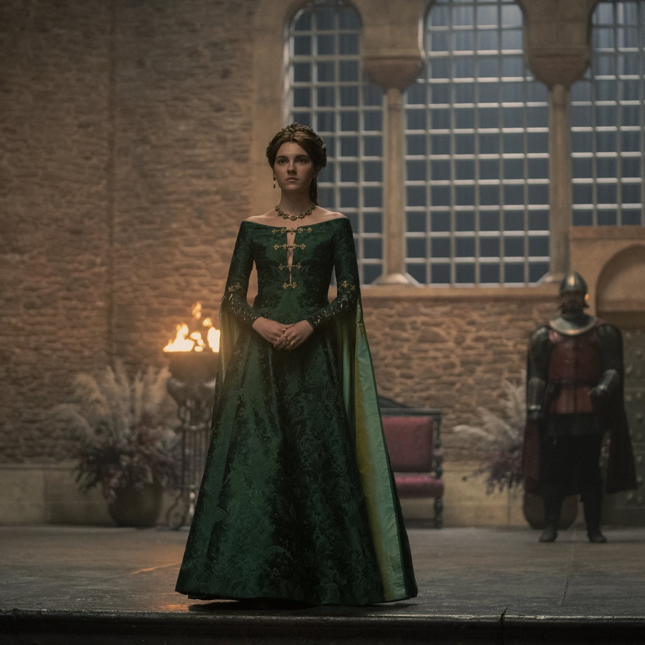 In particular, viewers are learning how figures in the pre-“Game of Thrones” Westeros cannon use the power of dress to enhance their agenda. We saw it with Cersei and her short cut and dark gowns alluding to revenge; with Daenerys and her shift from an innocent white wardrobe to the cloaks and gowns befitting of a monarch; and now, in episode five, the queen of Westeros, Alicent Hightower, takes centre stage. Hours late, she enters the great hall for the feast celebrating the wedding of Rhaenyra and Laenor, wearing an elaborate, green jacquard gown with gold appliqué. Fans are progressively seeing her character grow into her own, particularly through her dress, but this instance is even more nuanced.