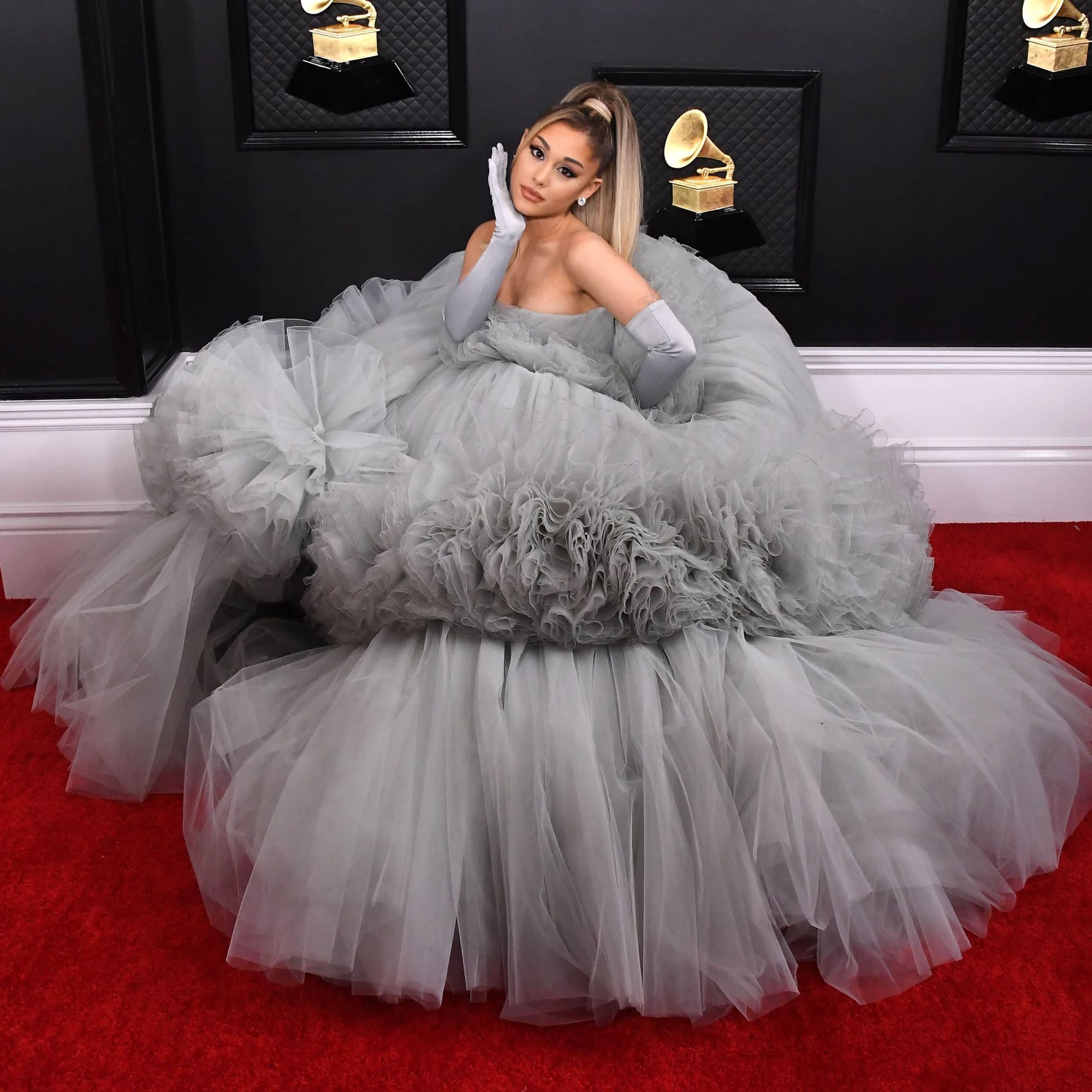 Ariana Grande took the Grammy Awards by storm on Sunday night when she walked the red carpet wearing a voluminous cloud gray Giambattista Valli ballgown. The “Thank U, Next” singer celebrated her many nominations with her parents by her side, and totally brought the drama as she posed for photos. Hey, when you have a massive tiered skirt, you have to show it off, right?