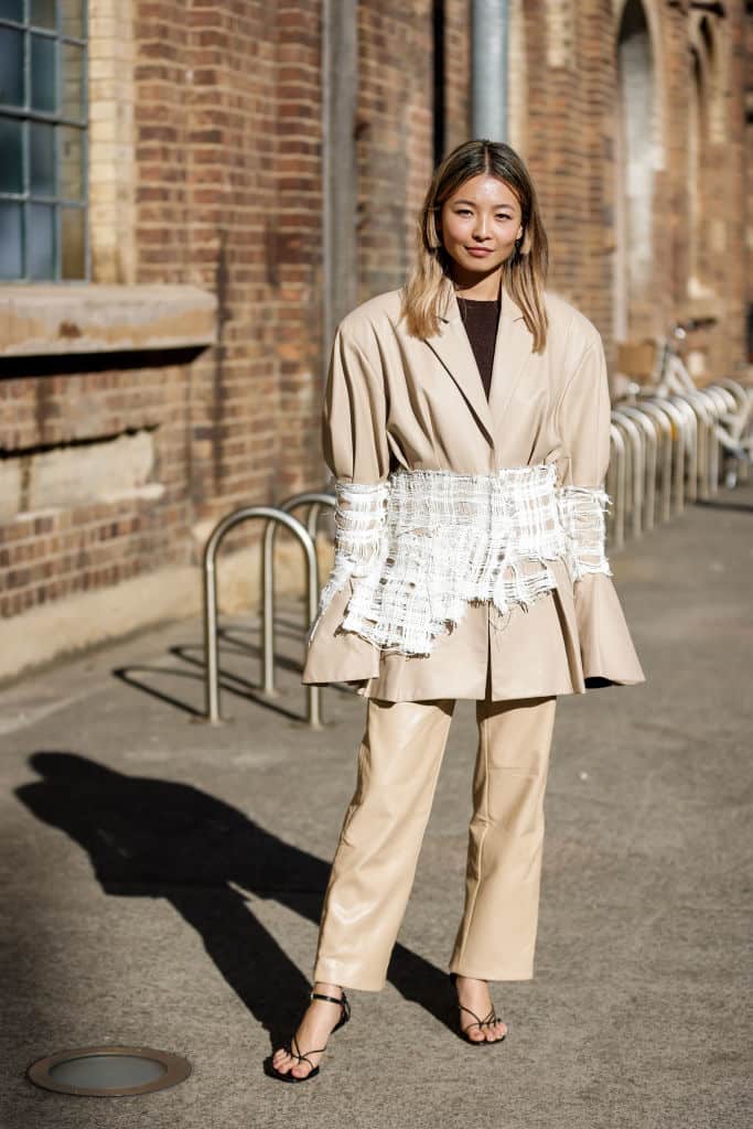 Yan Yan Chan went for a twist on a head-to-toe suit at Fashion Week in 2021, wearing this beige number from new designer Jordan Dalah with lace details over the sleeves and waist.