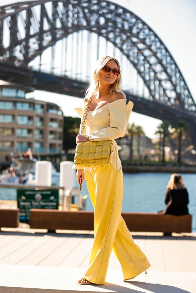 Whoever thought you couldn’t wear head-to-toe yellow? Nadia Fairfax showed us how at Fashion Week in 2021 when she wore a Paris Georgia top and pants and Bottega Veneta bag, all in yellow, paired with sunglasses from Banbe.