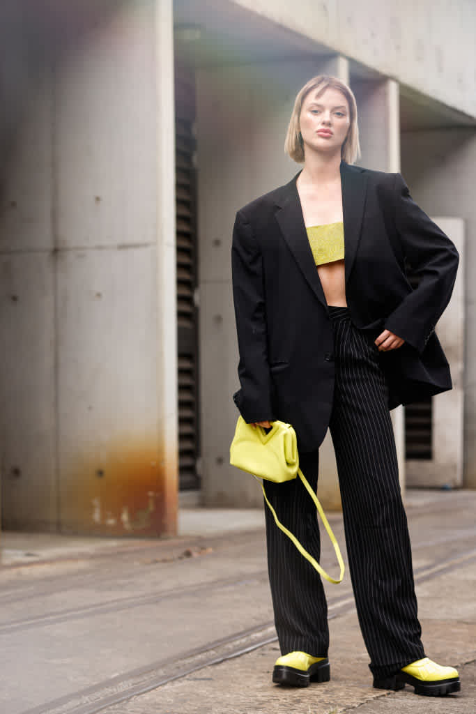 Model Elodie Russell gave us a lesson in how to jazz up a basic black suit. She added pops of yellow in the form of a Bottega Veneta shoes and bag, as well as a Nue Studio top, to a Dion Lee blazer and pants.