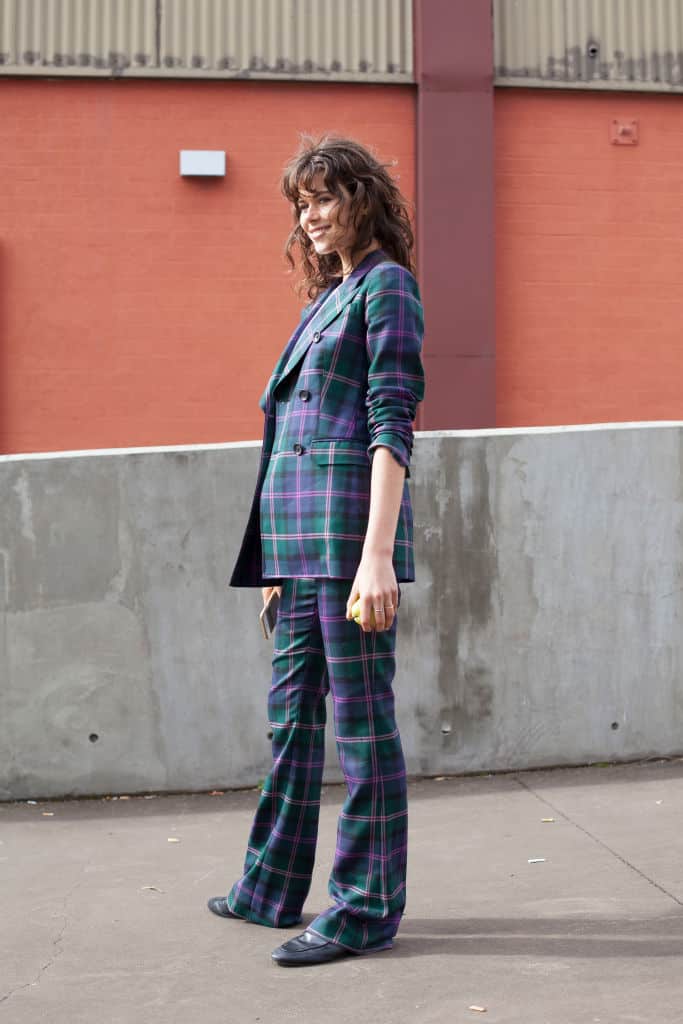Proving she really can pull off anything, Kiwi model Georgia Fowler went for matching trousers and a blazer in a plaid green and purple print at Fashion Week in 2017.