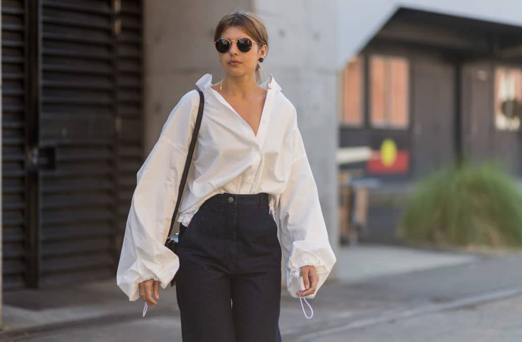 Known for her minimalist and elevated style, Talisa Sutton paired a white button up shirt with wide sleeves with navy pants and a black bag at Australian Fashion Week in 2017.