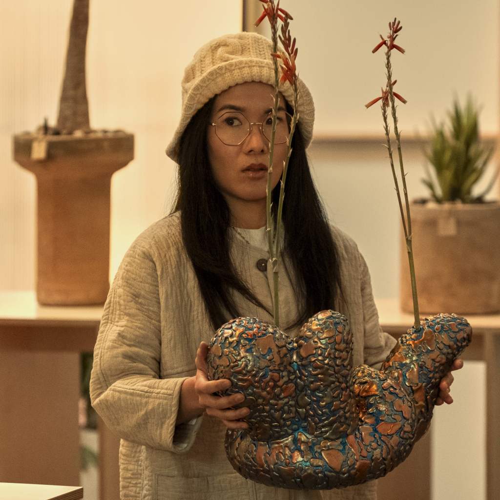 Huang describes Wong as “the dream actress to work with” because she isn’t afraid to “go full character.” Mirroring her wealthy plant business, Kōyōhaus, Amy’s style is simplistic, relaxed, and features pieces from independent designers and boutiques like Mohawk General Store, a multi-brand luxury retailer in LA. Mohawk co-founder Bo Carney, whose Instagram is full of chic outfit photos, was actually on the mood board Huang created for Amy, along with flower and plant shop owners she discovered on Instagram.