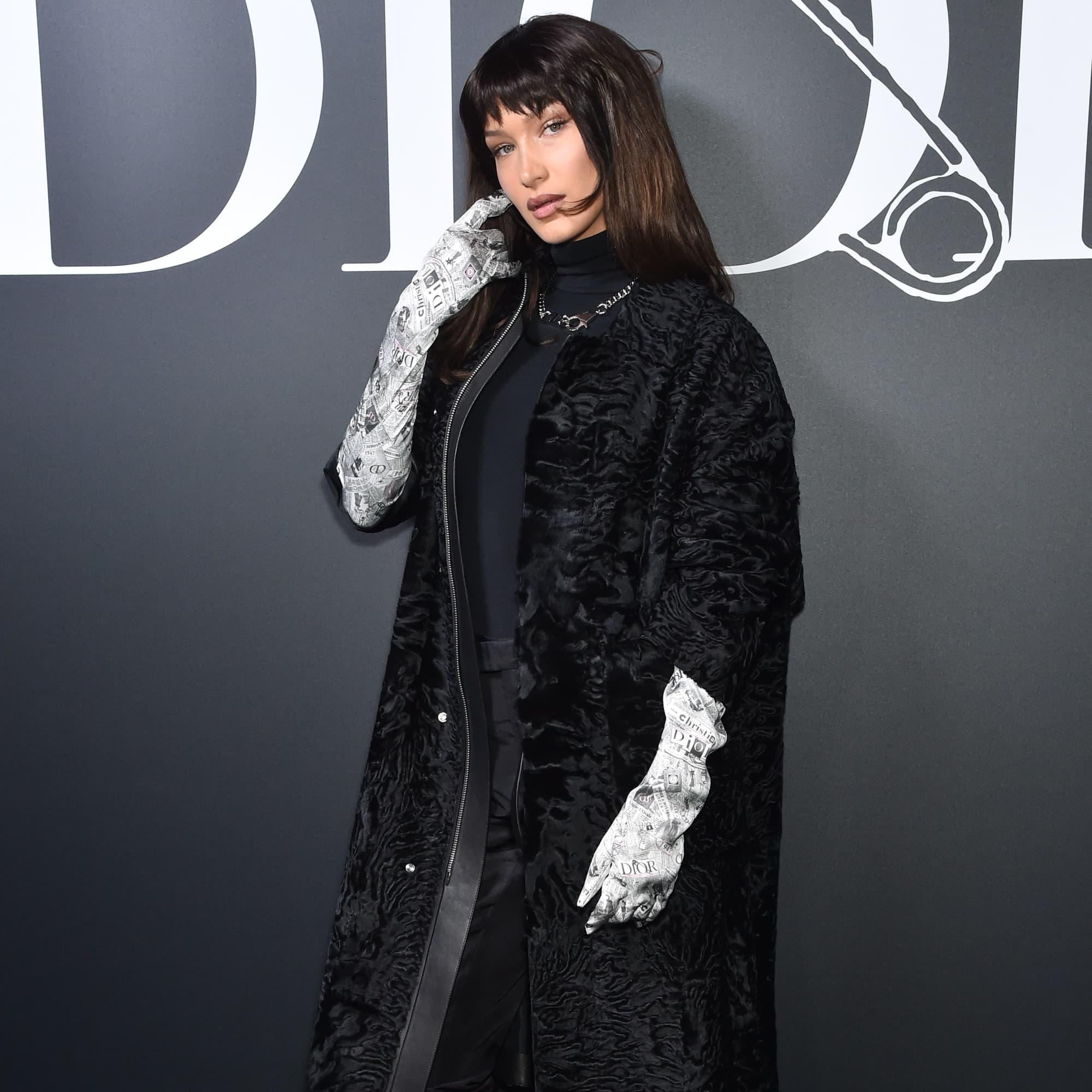 Cruela de Vil has finally met her fashion match in the form of Bella Hadid’s stylish outfit at Paris Fashion Week. While attending the Dior Homme Menswear Fall/Winter 2020-2021 show on Friday, Bella rocked a ruched Christian Dior black coat over a matching turtleneck and fitted trousers – and something tells me the 101 Dalmatians would be shaking because of how stylish she looks. Yes, Cruella is a villain, but the only thing villainous about this look is that Bella’s newspaper-print gloves probably cost more than my monthly rent. Later in the evening, she swapped her coat for a vegan leather shirt jacket from the The Very Warm. She also paired the look with a silver chain-link necklace and a pair of Nike low-top sneakers. Keep scrolling to take a closer look at Bella’s wickedly cool outfit from all angles ahead.