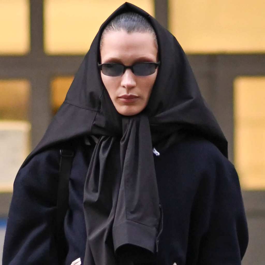 Bella Hadid is playing tricks on our eyes in her latest streetwear look. On Monday, the supermodel stepped out on the streets of New York City outside the Marc Jacobs fashion show in a pair of graphic jeans that created the illusion of shredded denim. The “ripped” jeans were screen-printed with a singed design that made the front of both legs appear carefully tattered and torn, all the way down to Hadid’s lustrous white platform loafers. She styled the jeans with a black varsity jacket layered over a lettuce-trim crop top, as well as a button-up shirt, which she wrapped around her head like a scarf to cover her blunt micro bangs.