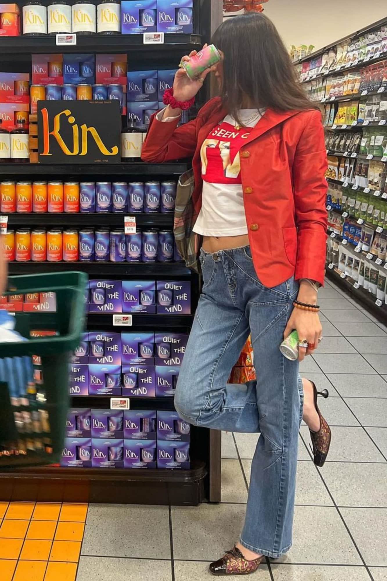 This is a more casual Bella Hadid moment — totally feeling herself in layers of denim. This is a great outfit idea for a mid-season moment, as it lends itself to light layering.