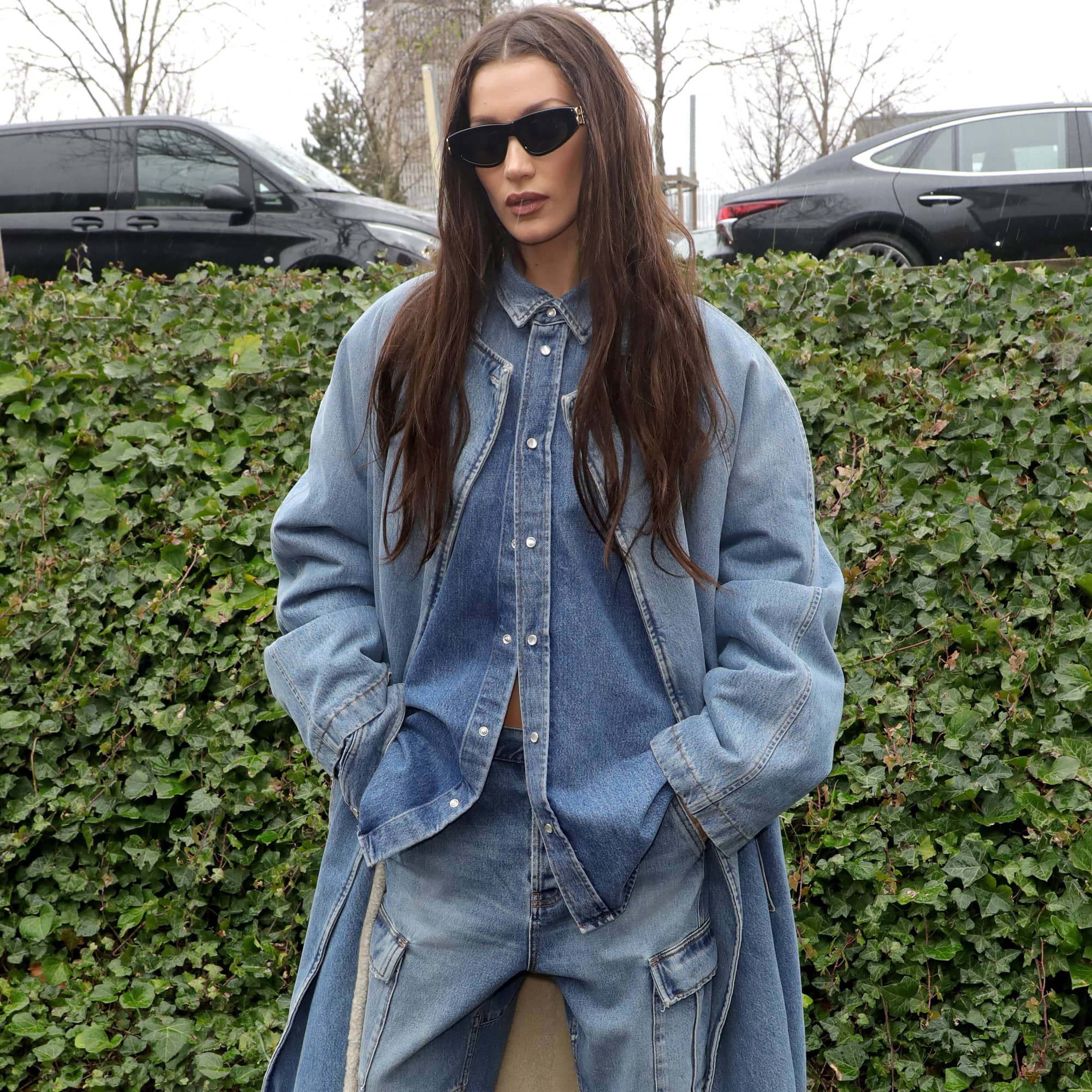 No, you haven’t traveled back in time and *NSYNC is not about to pop out of nowhere and break into a 2020 version of “Bye, Bye, Bye.” But Bella Hadid is definitely making me feel like I’ve taken a trip back to the early aughts with the oversize denim-on-denim look she wore while attending the Balenciaga Womenswear Fall/Winter 2020/2021 show during Paris Fashion Week. As if one layer of jeans wasn’t enough, Bella wore her coat open to reveal another denim shirt underneath and a beige crop top. So, yep, this is officially one of our favorite street style looks of the week.