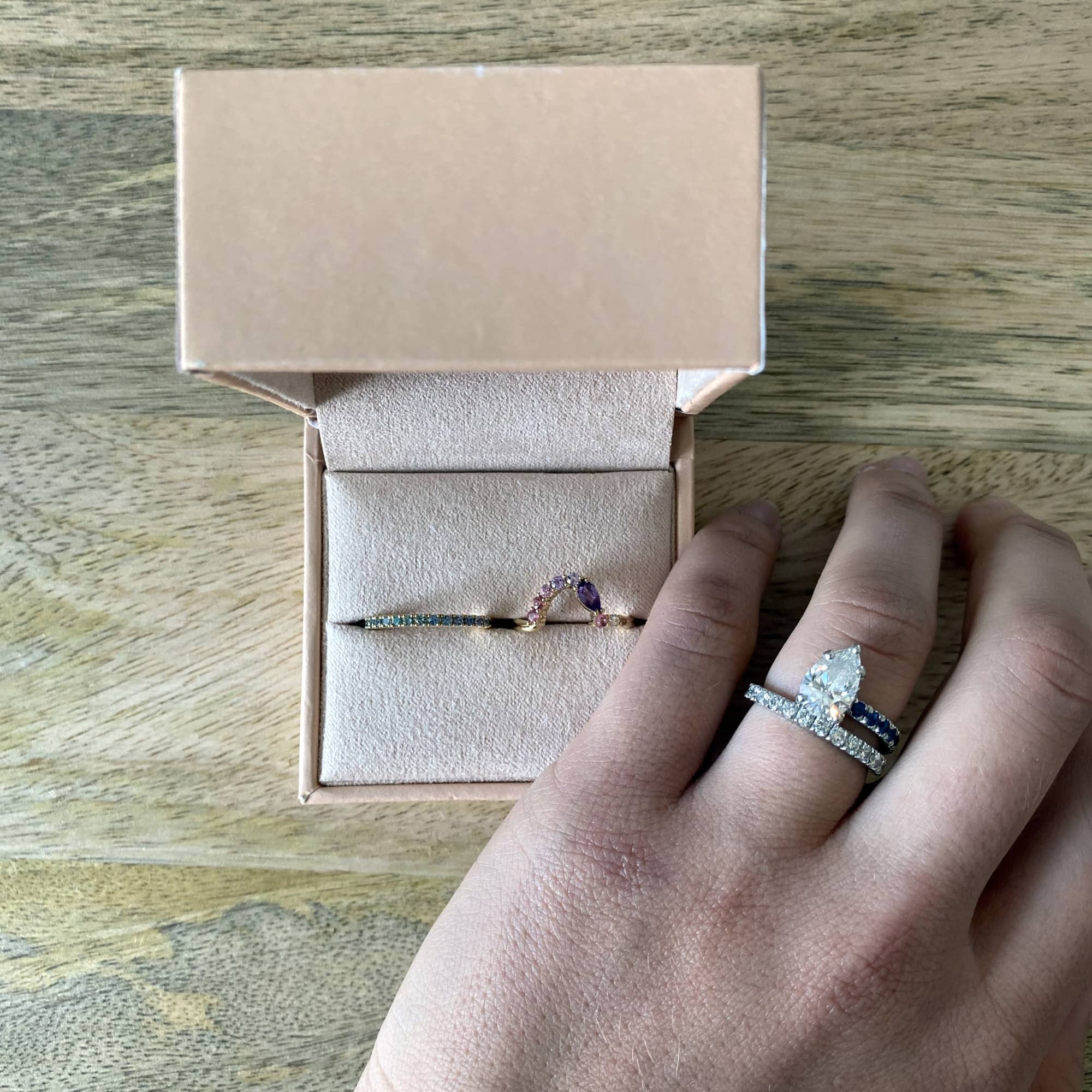After meeting with Jillian and her team via Zoom and sharing photos of my engagement ring from every angle (along with my ring size), I was sent a selection of bands in all different shapes the Marrow team had worked with before. I tried them on and found I was really excited about the idea of creating negative space with my stack. “We typically ask our custom clients to share any of our previous designs that stand out to them. We never duplicate a custom design, but it’s important to understand precisely what the client loves (and doesn’t love) so that we can work within those parameters for their project,” Jillian said.