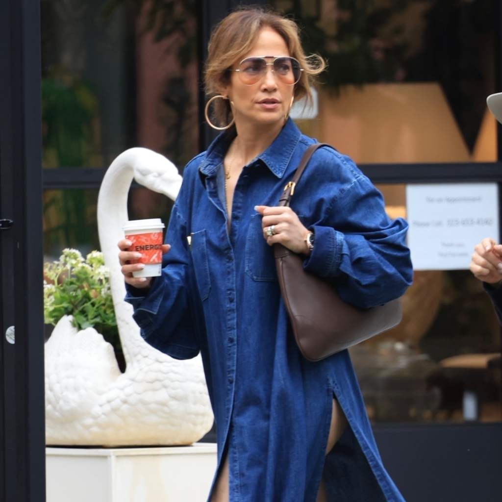 Most recently, the star stepped out for furniture shopping in West Hollywood, CA, bravely rocking a leg-revealing Valentino denim dress with waist-high slits that swished back and forth to showcase a pair of knee-high leather boots. The bohemian-inspired moment was rounded out with a color-complementing Gucci purse, translucent aviator sunglasses, oversize gold hoops, and her green-stone engagement ring and wedding-band stack. Opting for minimal makeup and a slightly messy updo, Lopez’s ensemble screamed “on the go” but was nevertheless as sultry and considered as ever thanks to her willingness to take on boundary-pushing trends.