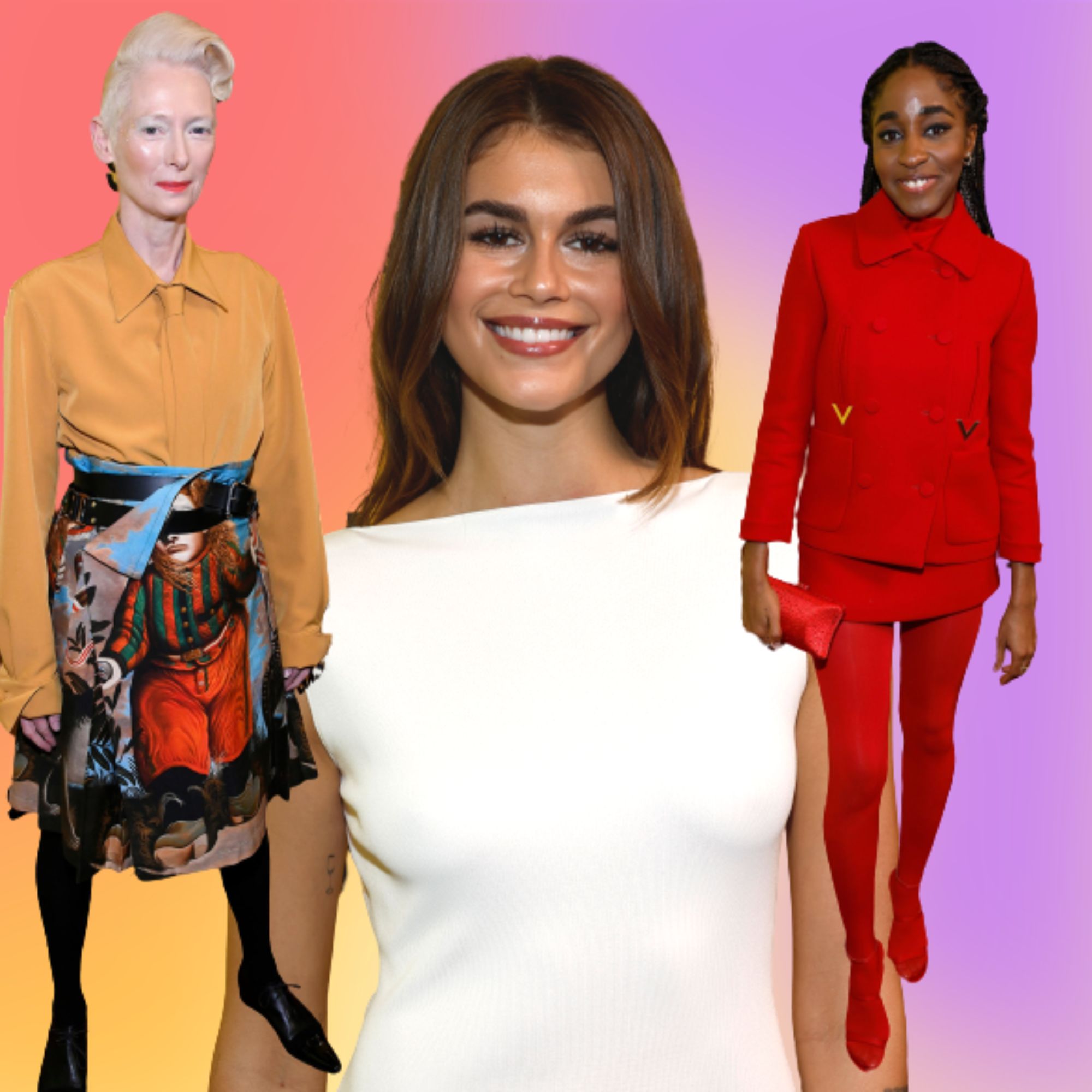 While Kaia Gerber has kept it classic and minimal, Tilda Swinton has brought her iconic Vivienne Westwood-esc ice-queen look to the carpet, plus many up-and-coming comics and actors making bold choices with fabrics and colours.