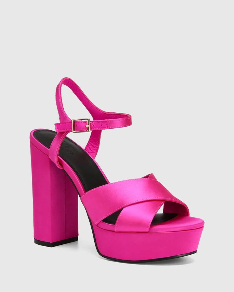 These chunky platform sandals by Wittner ($240) are incredible! Absolute showstoppers, they feature a twelve centimetre heel and a recycled satin upper, with leather lining and a block heel. Not into the Barbie pink? They also come in red satin or black suede.