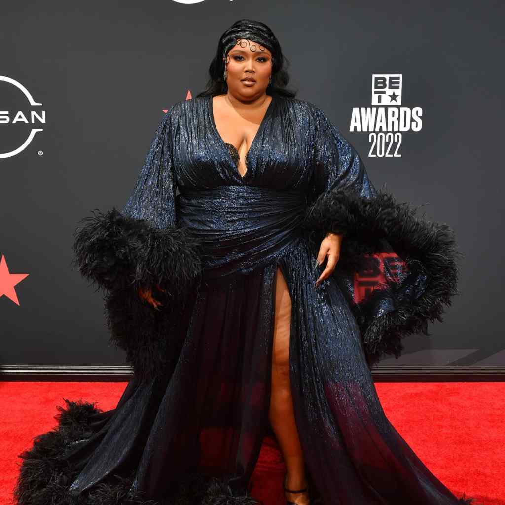 Lizzo – who is set to perform at the show tonight and won the BET Award for Best Female R&B/Pop Artist back in 2020 – arrived wearing a floor-sweeping navy blue lurex gown with feather accents on the sleeves and hemline, a dazzling shimmer effect on the fabric, and a thigh-high slit. She completed the look with peep-toe platform pumps.