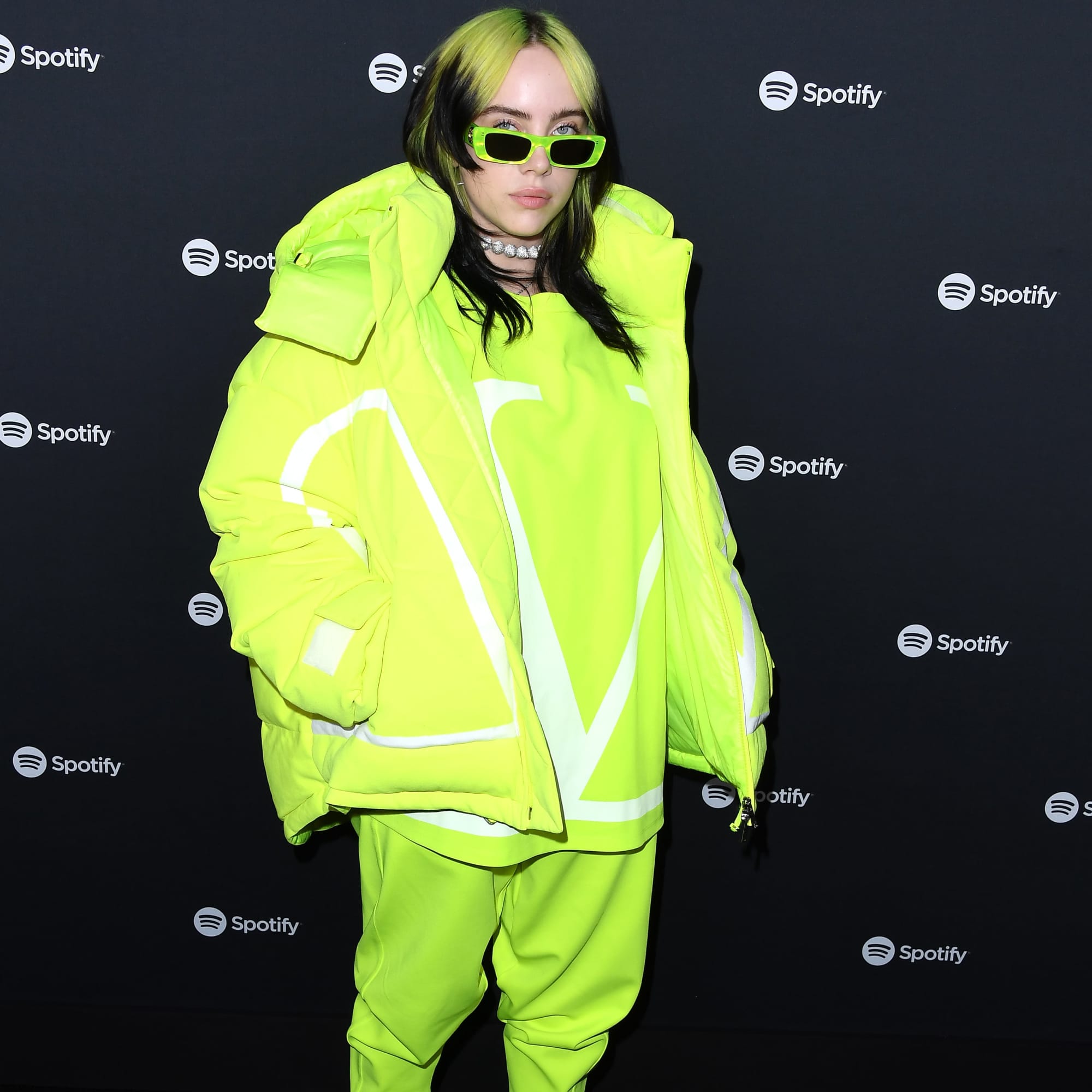 Billie Eilish is living proof that you can never have enough neon in your wardrobe. The “Listen Before I Go” singer attended the Spotify Best New Artist 2020 Party in Los Angeles on Thursday in a slime green (or possibly highlighter) Valentino puffer jacket, matching joggers, and an oversize T-shirt. Billie paired the look with Gucci sunglasses that were an equally dazzling shade of green and sneakers that blend right in with the rest of her outfit.