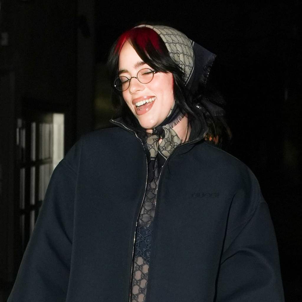 The logo print perfectly matched her sheer top, which was overlaid on little more than a black bra top. Keeping it understated with a pair of loose-fitting jeans, Eilish tied her hair back in a matching logo head scarf, a slight bit of her bright red showing through. With a deep black cat-eye, her piercing blue eyes looked more head-turning than ever.