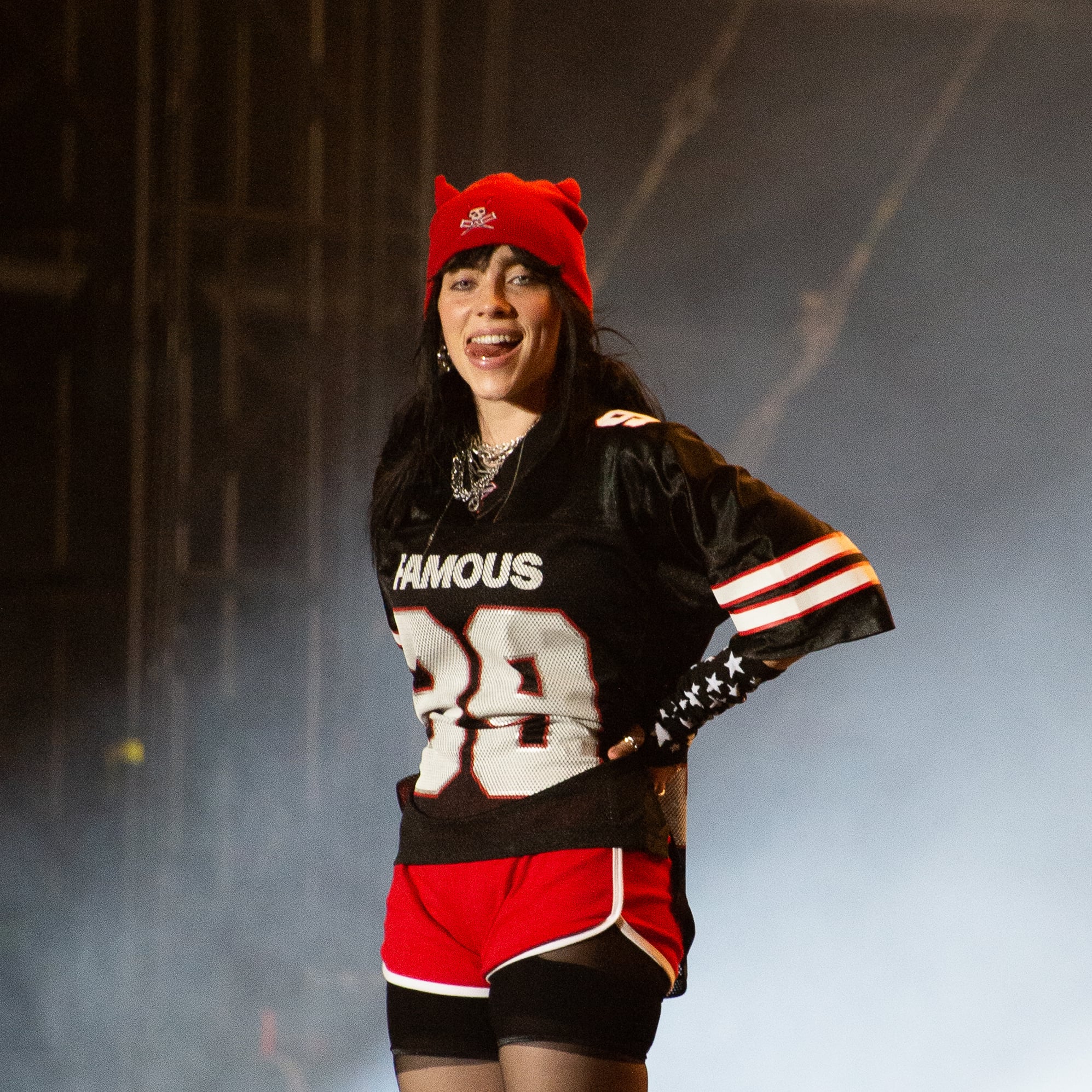 Leave it up to Billie Eilish to go against the status quo with her signature sense of style. On Aug. 15, the 21-year-old continued her obsession with the Y2K aesthetic while performing at the Sziget Festival in Budapest, Hungary. In true Billie Eilish fashion, she took the stage in a black oversize jersey that read “FAMOUS” along with the number 99 and chose the most unconventional bottom – a pair of red mini dolphin shorts layered over see-through black biker shorts and sheer tights. She slipped on red, black, and white striped socks with a classic pair of Air Jordan 3s – originally released in 1988 – further accessorizing with a red skull-printed beanie, long fingerless gloves with black and white stars, and a variety of silver jewelry.