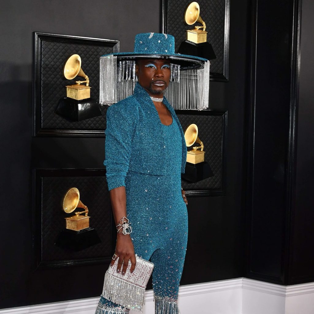 Billy accessorized the outfit with a large bracelet shaped like a spider, a diamond collar necklace, and ring all by Alexis Bittar. His glittery fringe purse, rhinestone go-go boots, shimmering silver nails, and a thick blue cat eye bound to earn him a 10 out of 10 at any ballroom show. See Billy’s incredible Grammys look from all angles ahead.