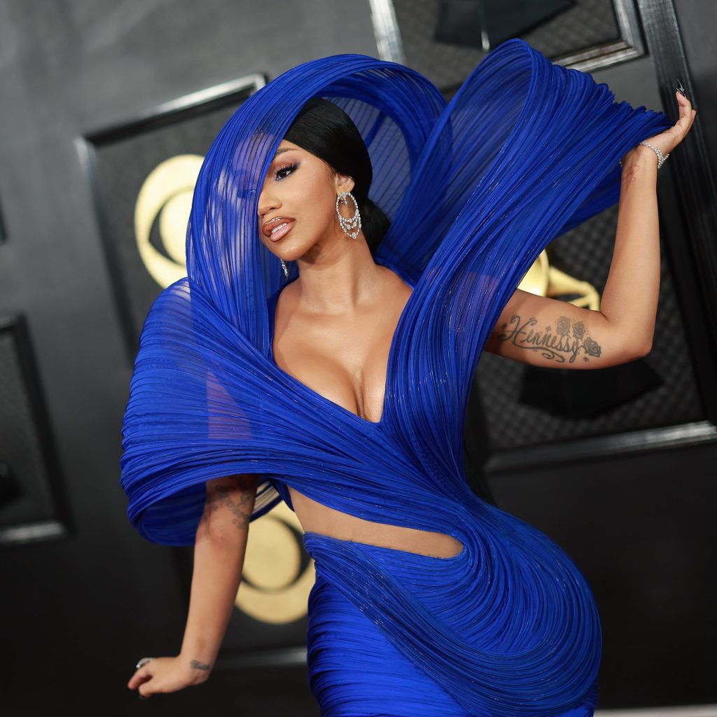 Cardi B is back on the red-carpet circuit. A day after attending the pre-Grammy gala, on Feb. 5, she arrived at the 2023 Grammys in a striking electric-blue gown designed by Indian couturier Gaurav Gupta, who’s known for his innovative, architectural dresses. In addition to the sculptural hood, the floor-length number came with a plunging neckline and sizable cutout across the stomach. Styled by Kollin Carter, Cardi complemented the look with statement diamond earrings and matching blue eyeliner.