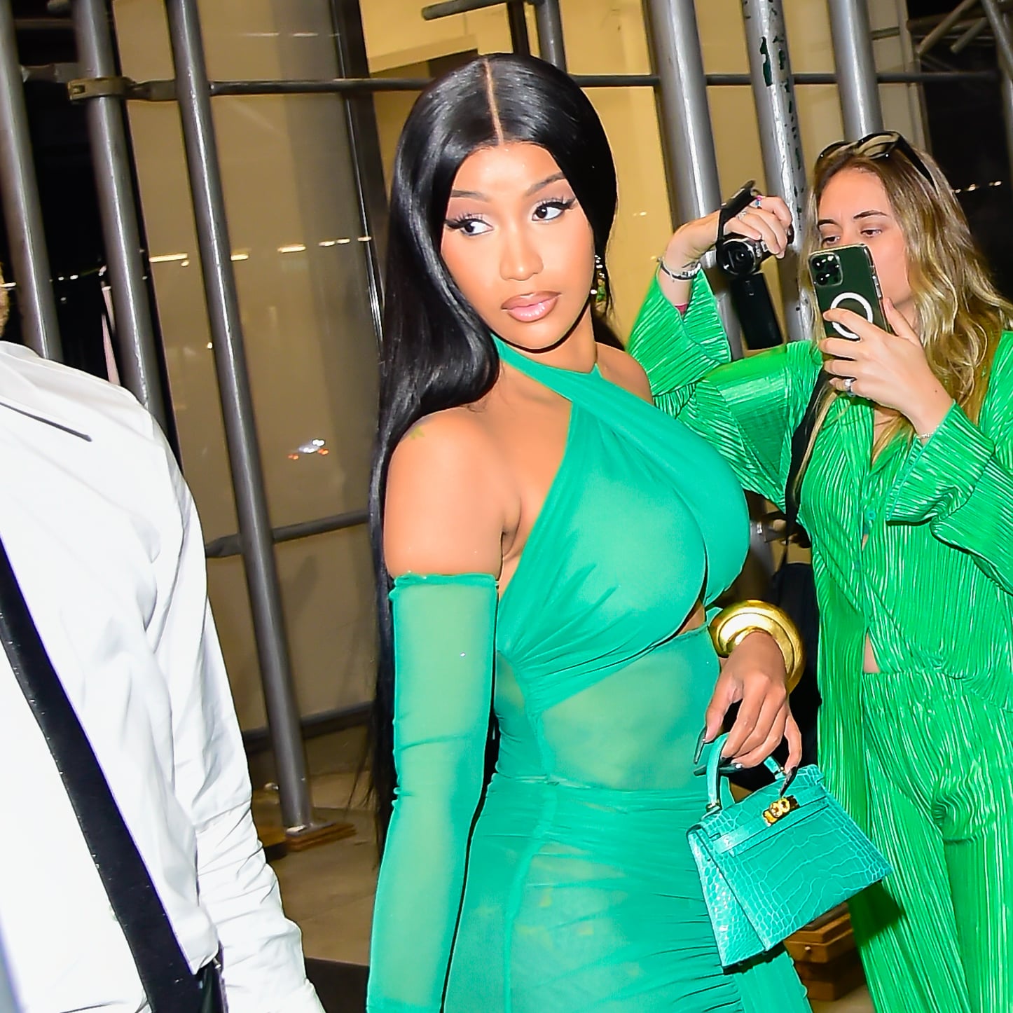 Cardi B is entering her “Bongos” style era. The rapper wore a bright green dress to host her own MTV VMAs afterparty in the early morning hours on Sept. 13, and the vibrant look fits right in with the colorful swimsuits she and Megan Thee Stallion wear in their latest music video. Cardi’s gown was completely sheer, allowing several of her tattoos to peek through, and featured a ruched skirt, crisscross halter neckline, and detached sleeves resembling handless opera gloves.