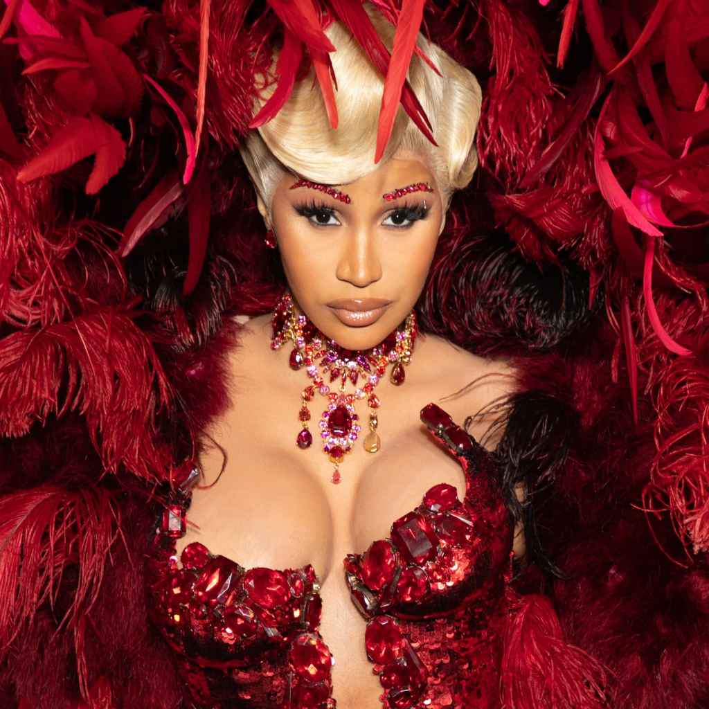 Cardi B just set the bar for grand entrances at Paris Fashion Week this year, and it’s shrouded in red feathers and enough glitter to light up a Las Vegas stage. On Sept. 28, Cardi attended the Mugler fashion show and made her first public appearance since giving birth to her second child earlier this month. Dressed to the nines, the “WAP” singer held nothing back in a fitted red sequin dress with a low-cut sculptural neckline. But the true pièce de résistance was her flowing red cape adorned in thousands of scarlet feathers. Like a headpiece and shawl in one, the luxurious cape framed Cardi’s Old Hollywood hairstyle and figure-hugging gown in a way that made it hard to tear our eyes away from the extravagant look.