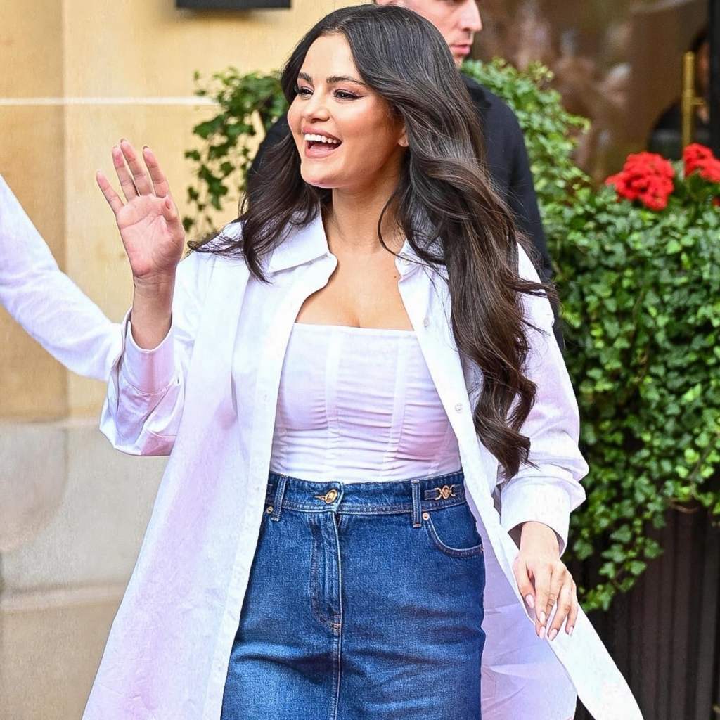 Gomez stepped out during Paris during Fashion Week on Sept. 27 sporting a crisp white boyfriend shirt worn unbuttoned over a ruched tube top from Are You Am I. She finished the look with a Versace denim miniskirt and snakeskin over-the-knee boots from Stuart Weitzman.