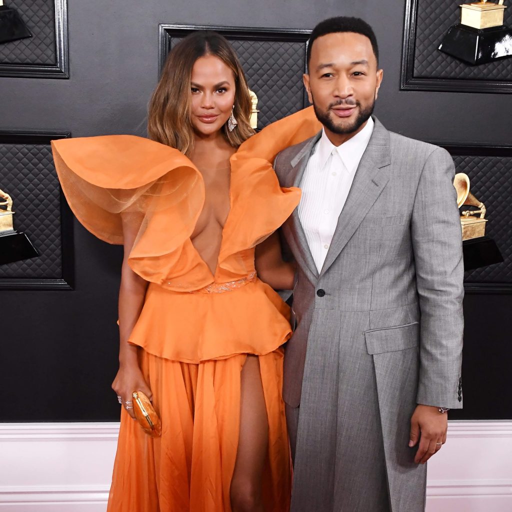 Chrissy Teigen was so absolutely glowing at the Grammys on Sunday night, even John Legend had to step back and admire her as they walked the red carpet together. The Cravings cookbook author stunned in a bright orange Yanina Couture gown from the designer’s Spring/Summer 2019 collection and rose gold Giuseppe Zanotti heels. The stunning dress featured a plunging neckline and a hip-high slit, along with dramatic sleeves layered sleeves. She tied the whole ensemble together with a matching clutch and dangling earrings, keeping the rest of her jewelry minimal. With an outfit like this, you let the dress do the talking! Check out more glimpses of Chrissy’s dress below.