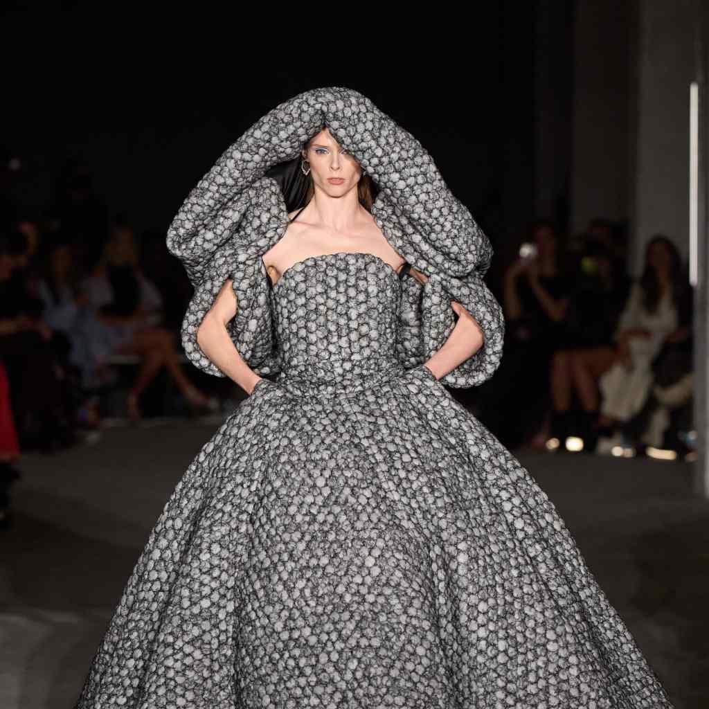 Models paraded in extravagant silhouettes – some wearable, some avant-garde – drenched in a classic autumnal palette of black and deep blue. There was lots of patent leather fashioned into an asymmetric dress, a power suit, a bow-front strapless midi, and even long “Bridgerton”-inspired gloves. Elsewhere, classic Victorian fashion elements materialised in corset-style dresses, dramatic headpieces, pannier skirts, and a voluminous sky-blue cape. At times provocative (think like a sheer pink corset or a Matrix-style cutout slit dress), other times conservative, but always modern, the collection aptly mirrored “the tension of the age we live in.” In the end, model Coco Rocha walked down in a hooded, patterned ballgown, which felt like a fitting finale look.