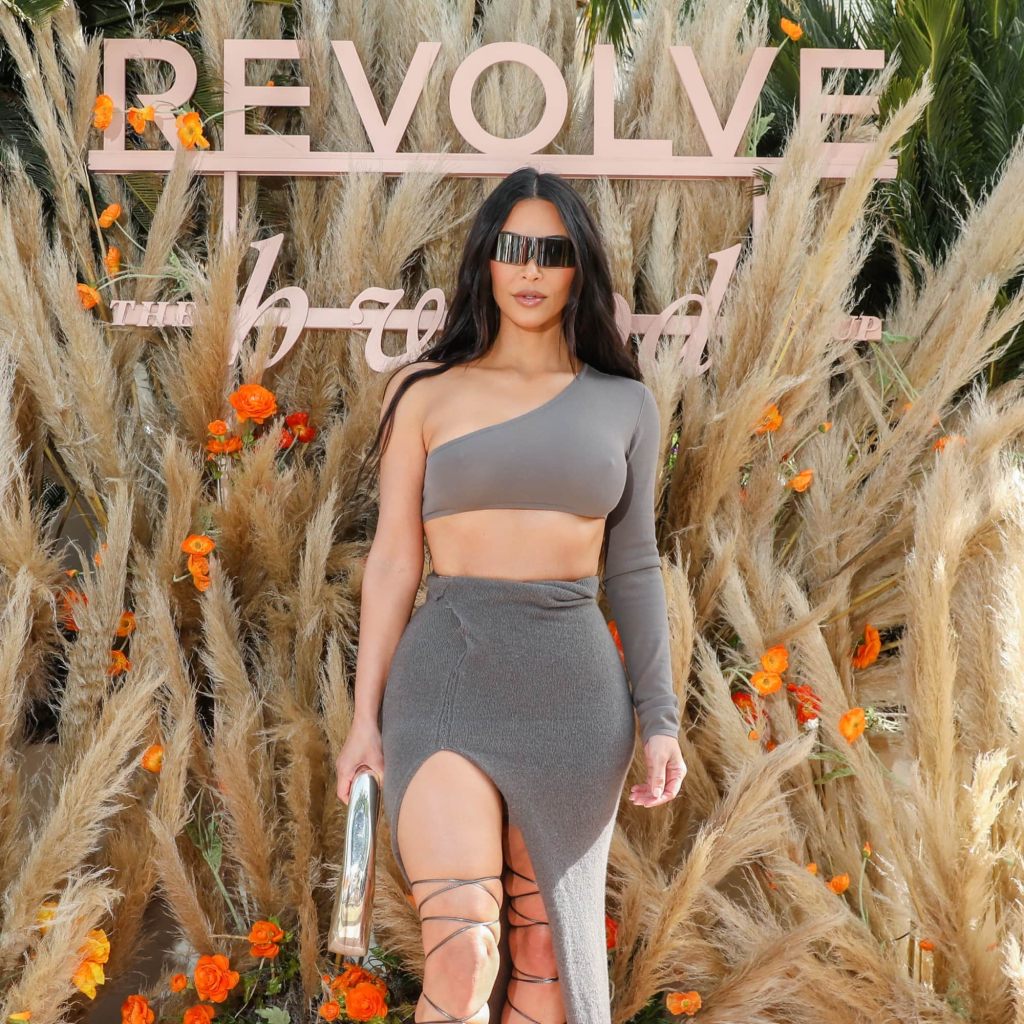 Among them, Kim Kardashian stepped out at the Revolve Festival in a two-piece grey Rick Owens ensemble featuring a long-sleeved crop top and a high-slit, floor-length maxi skirt. The reality star accessorised with matching strappy heels laced up to her knees, a round silver top-handle bag by Coperni, and large rectangular sunglasses. She parted her hair in the middle, her wavy curls falling on the side to emphasise her asymmetrical top. The Skims founder was joined by her sister Kendall Jenner, who also got the one-shoulder memo, opting for a pale-blue House of Harlow x Revolve 1960 off-the-shoulder minidress finished with crescent-moon opera gloves, lime-green boots, and gold hoops.