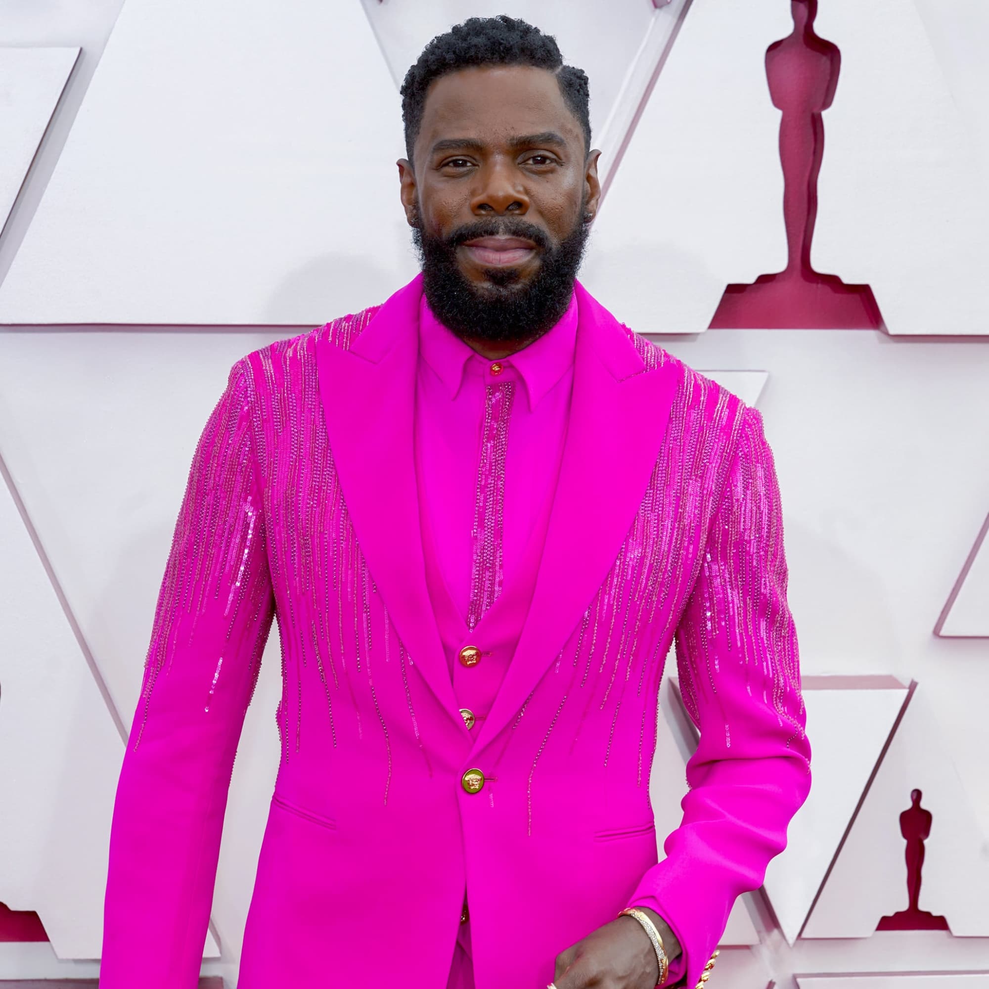 Colman Domingo sure knows how to make a fashion statement on the red carpet. During the Oscars on April 25, the Ma Rainey’s Black Bottom actor pulled up to the show looking like an absolute ray of sunshine in a stunning hot pink suit. Colman shared in his Instagram Stories that he was wearing custom Versace “for the culture.” He was one of the first to arrive during the Sunday night show, and we’re so glad because it gave us extra time to see all the stunning details throughout Colman’s outfit. The suit is adorned with gold buttons and 4,500 Swarovski crystals and sequins down the jacket and shirt. He wrote on social media that the embroidery took 150 hours to complete!