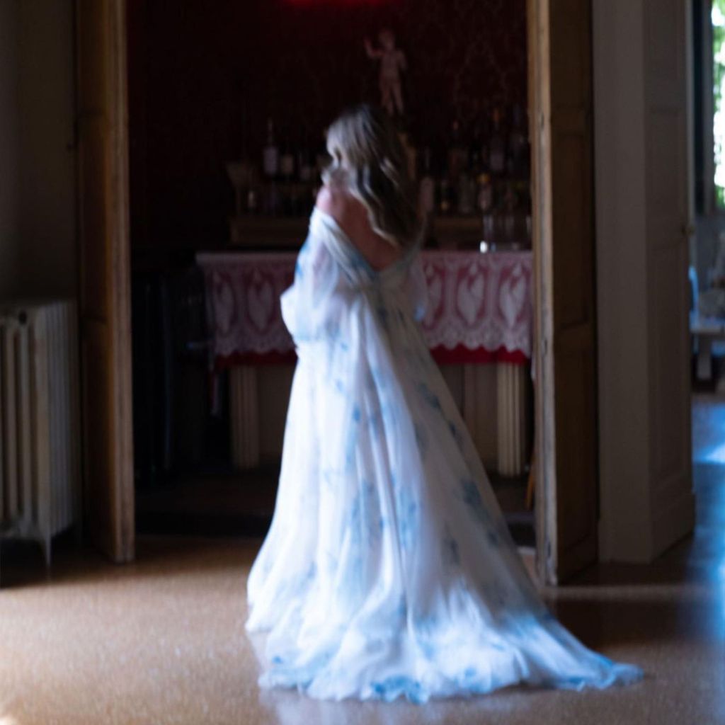 Exhibit A: Jessica Andreatta, Designer and Creative Director of Australian bridal brand J.Andreatta, who married recently in Puglia, Italy and wore a blue floral print organza overlay gown for the occasion.