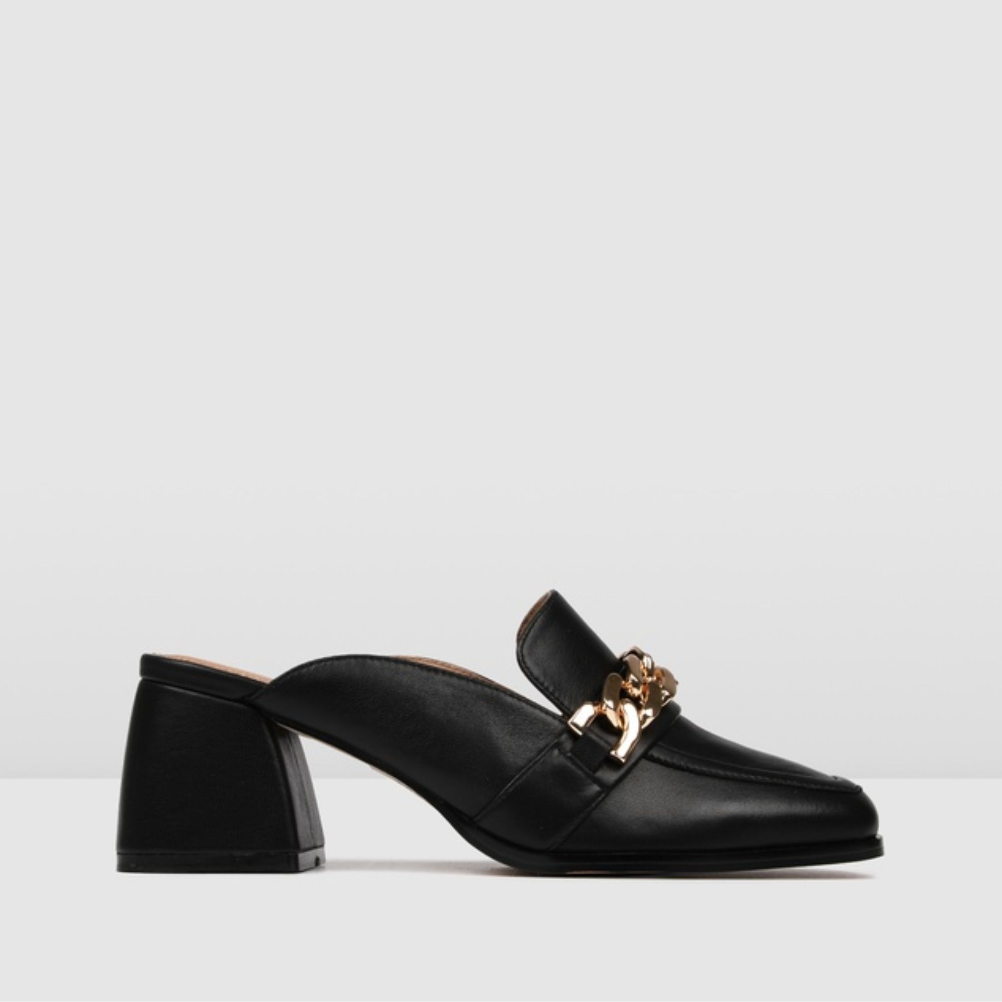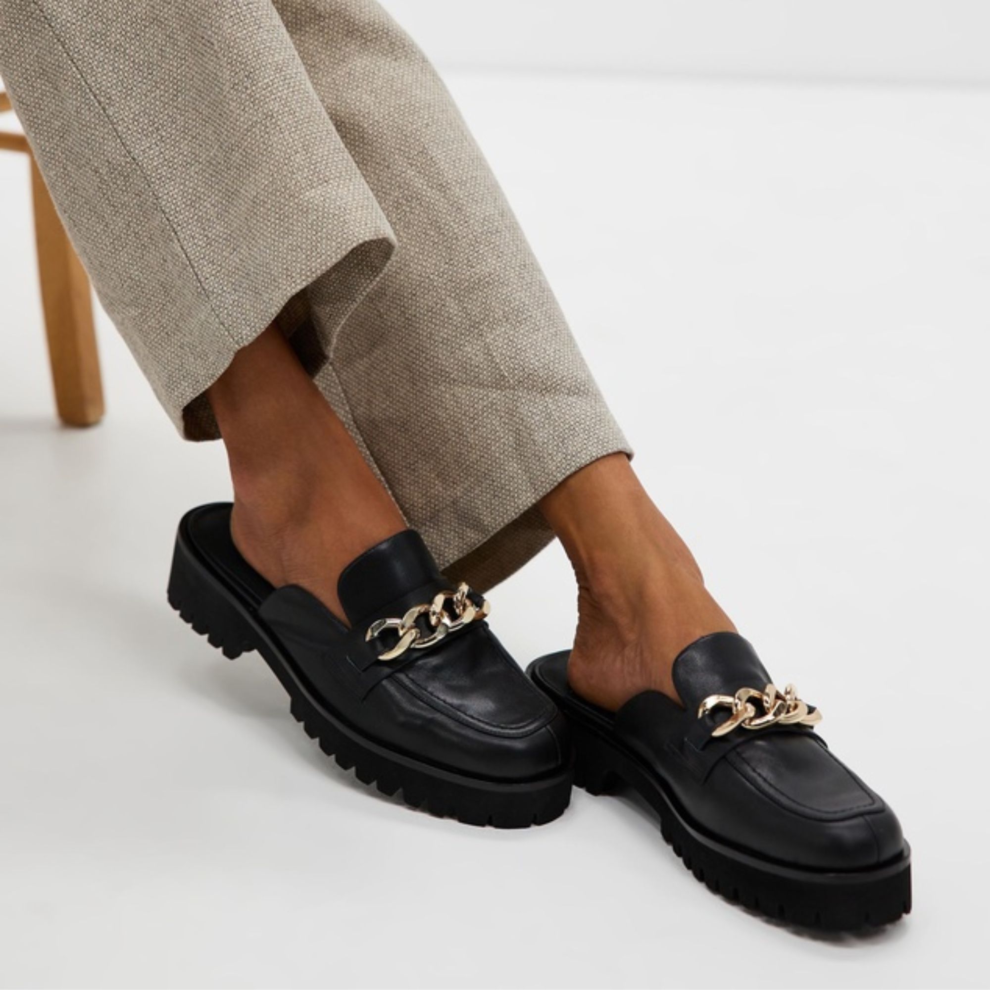 The Jo Mercer Darius Mid Heel Mules ($199.95 with an extra 20 per cent off at checkout) are square-toed and have a soft, gold-toned flat metal chain over the vamp.