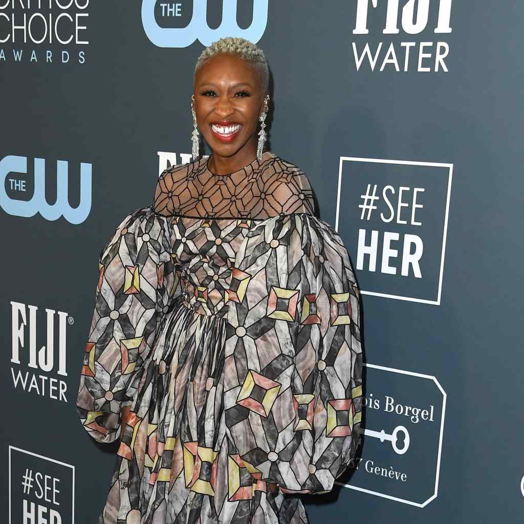 Cynthia Erivo made an entrance to remember at the 25th annual Critics’ Choice Awards. For the award show, which took place in Santa Monica, the British actress walked the red carpet wearing a Fendi Couture look from the Fall/Winter ’19 collection. The stunning gown came in a marble/mosaic-print and even featured beaded embroidery! The print also reminded us of a color by numbers worksheet from our childhood, which we absolutely loved. The gorgeous gown featured puff sleeves that added some drama and a long train that made for a dramatic exit. She accessorized with a pair of silver dangling earrings and rings by David Webb. See all angles of her gown ahead.