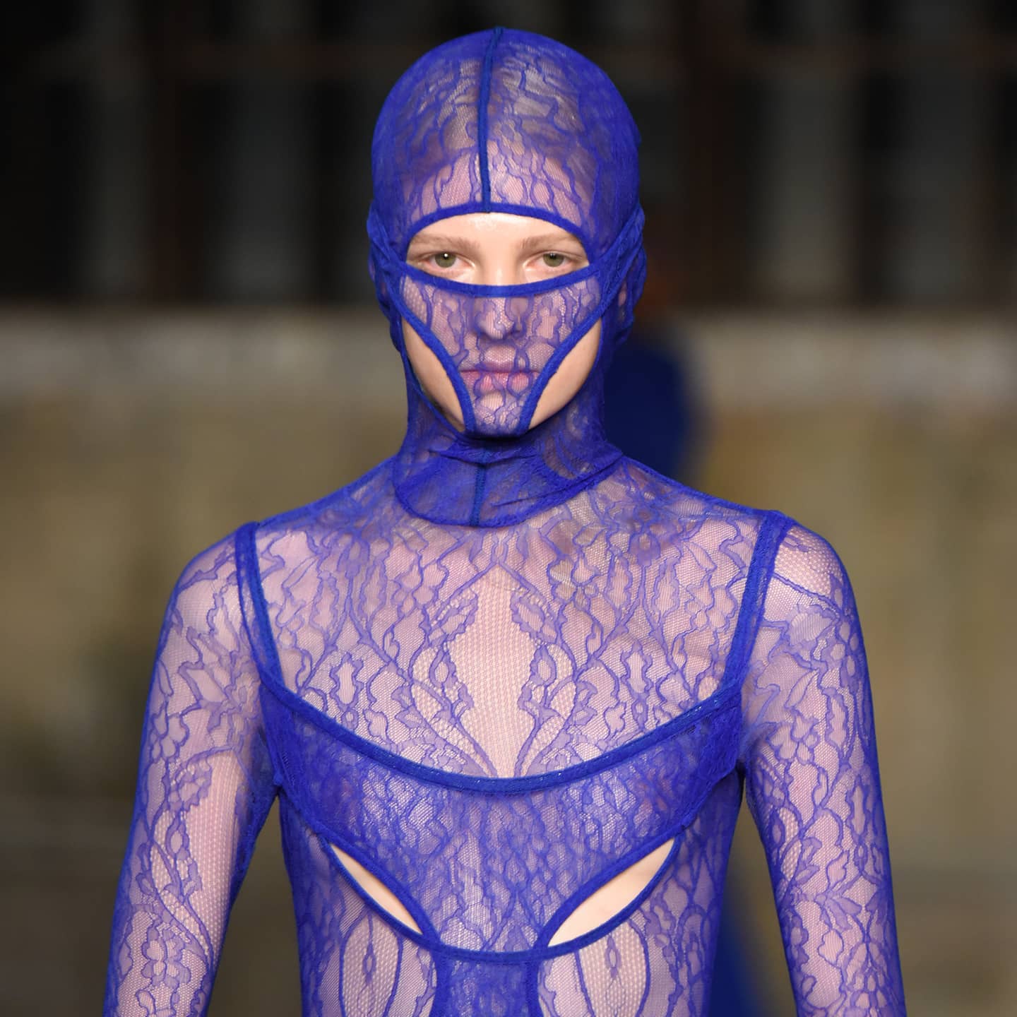 At the Dion Lee runway show, models wore thong-shaped fabric over their nose and mouth in bright-blue lace and neutral canvas, cut from the same material as their outfits. Lee said he drew inspiration from his surroundings for the unconventional face coverings. “I was looking at the idea of architectural facades and masks, obviously the influence of face coverings at the moment – feeling like it becomes part of your identity in a way,” the designer told WWD.