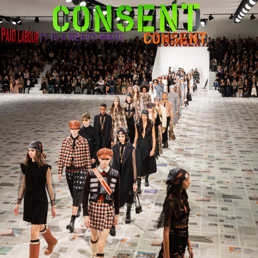 Dior’s Fall/Winter 2020 show for Paris Fashion Week started on an expectedly feminist note. Glowing neon signs with the phrases “Consent,” “Women’s Love Is Unpaid Labour,” and “We Are All Clitoridian Women,” designed by Claire Fontaine, flashed defiantly to the spoken-word song of “Lions” by Jenny Hval and Vivian Wang.