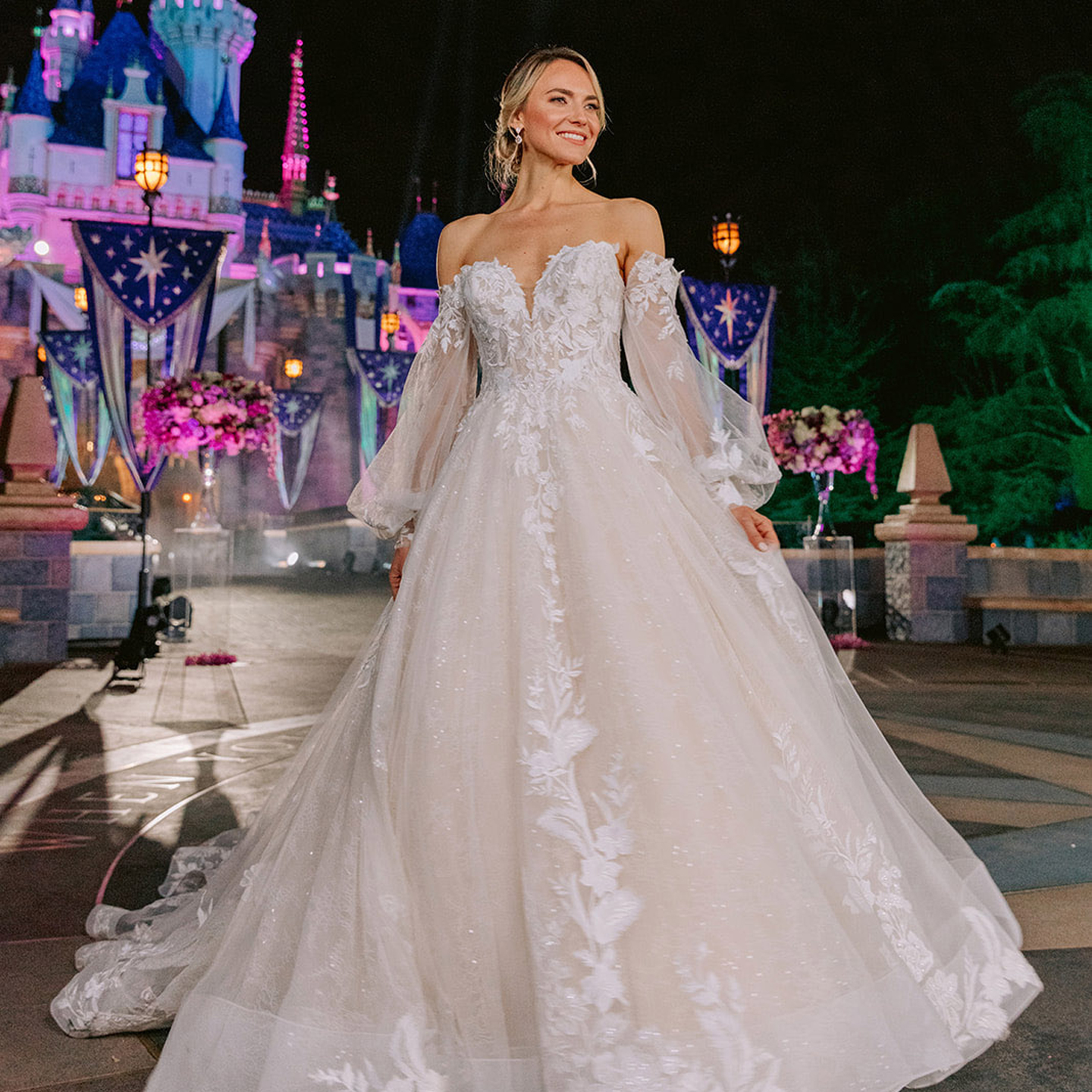 It’s 3 a.m., and I’m at Disneyland. Where popcorn carts and visiting families once stood are now camera cranes and models. We’re all gathered here in the middle of the night for the taping of a fashion show for Disney’s Fairy Tale Weddings, which just released its newest bridal collection featuring dresses inspired by nine princesses. Taking place in front of the park’s pastel castle, the fashion show also revealed the addition of bridesmaid dresses.