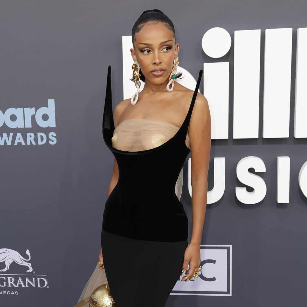 Doja Cat delivered a surrealist look on the 2022 Billboard Music Awards red carpet that will go down as one of the most iconic in the event’s 32-year-long history. Working with Schiaparelli creative director Daniel Roseberry and her stylist, Brett Alan Nelson, to orchestrate the breathtaking moment, the rapper donned a sculptural black corset in moulded velvet with two protruding horns emerging from the plunging, rounded neckline. A nude swath of silk illusion-tulle fabric was wrapped into a bandeau top across her chest, trailing behind her to create a whimsical train. Doja also added gold nipple pasties from Agent Provocateur, which perfectly matched her gilded accessories. She teamed the sartorial masterpiece with a long column skirt in black crepe.