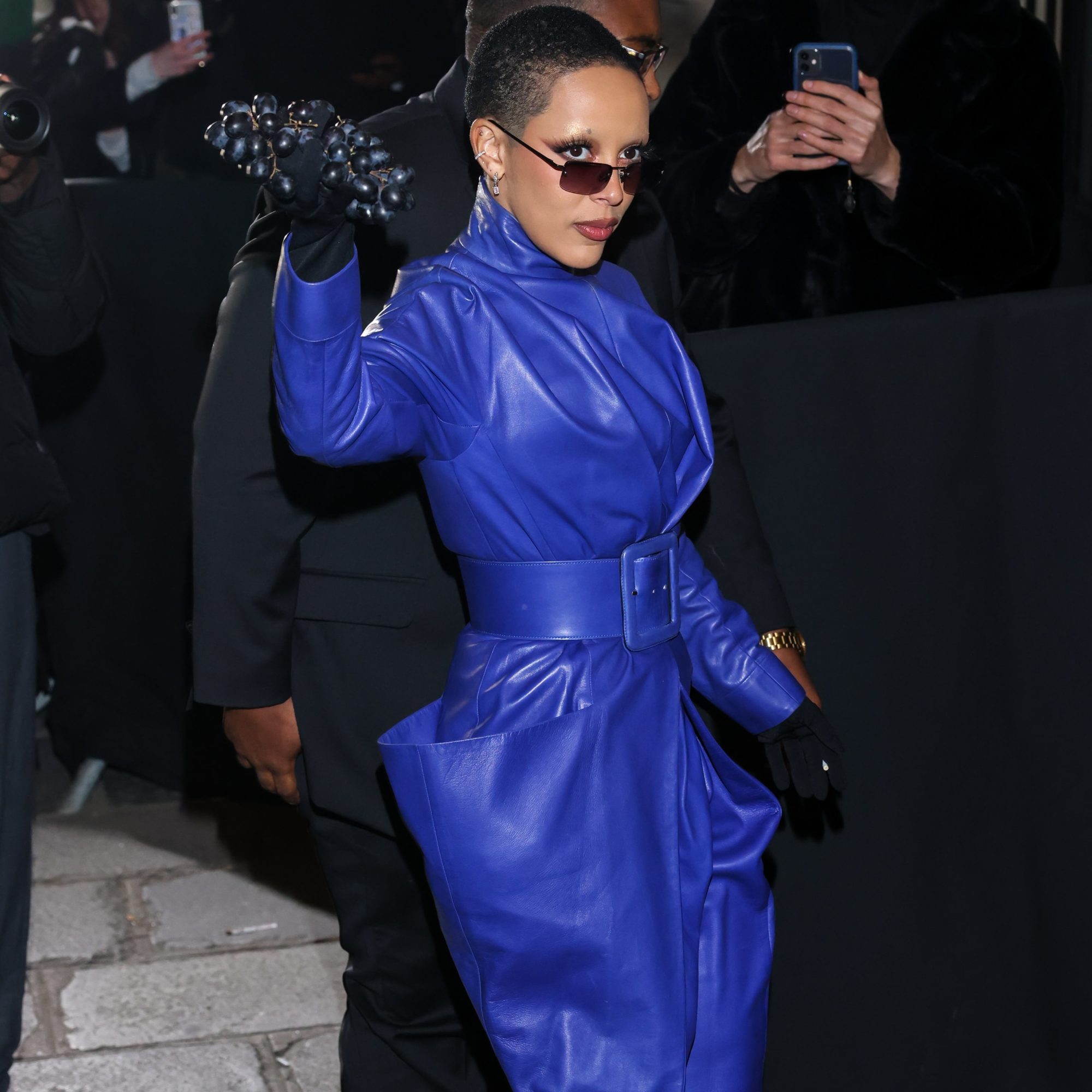 Doja Cat headed into the Jean Paul Gaultier show with grapes in hand, sporting a cornflower blue leather jacket and dress set. She brought the look together with black sheer tights, black gloves, square sunglasses, and sculptural patent Mary-Jane shoes. In true Doja Cat style, she proceeded to feed herself on the step and repeat for cameras, making a cluster of grapes the most talked-about accessory on TikTok.