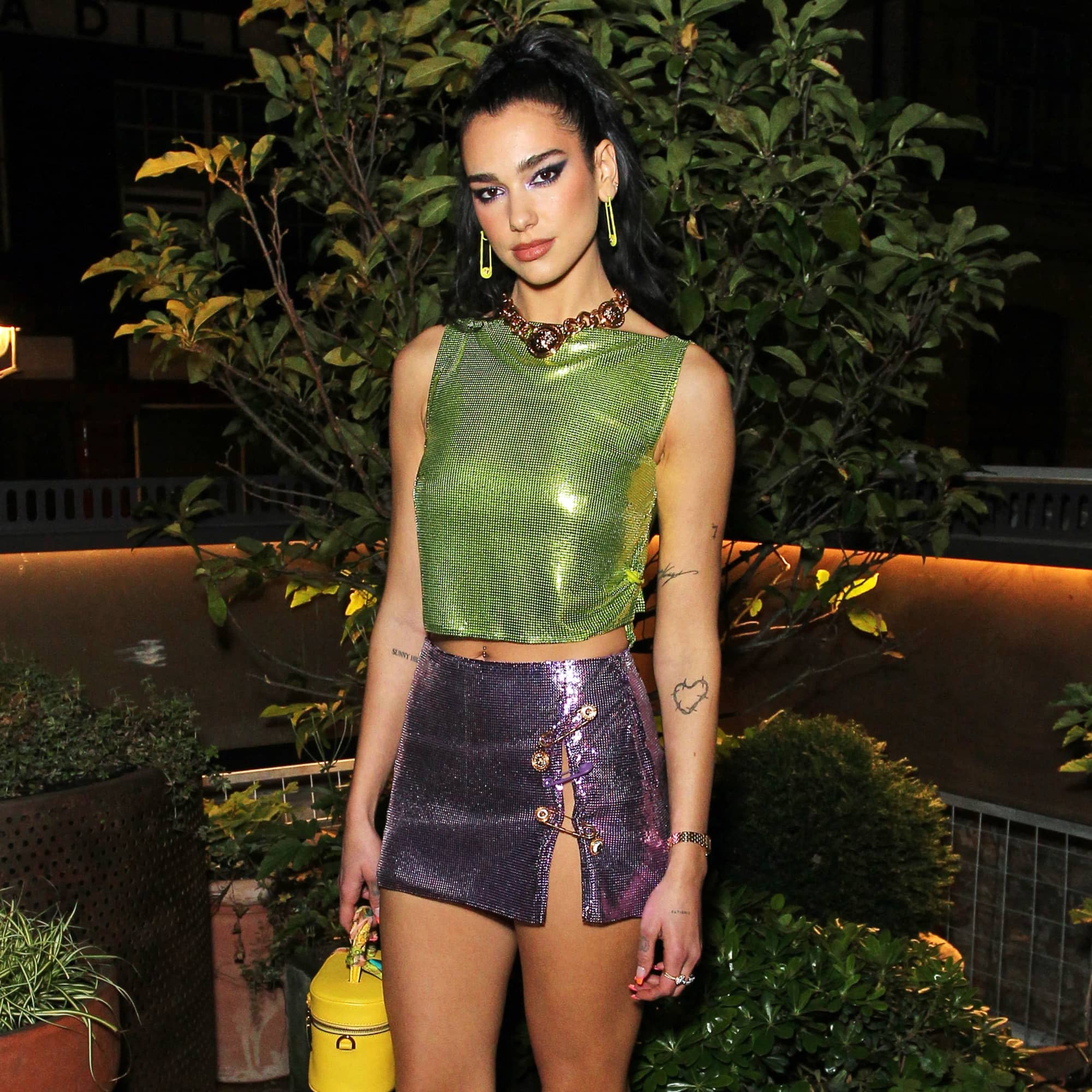 Designed by Bottega Veneta, Lipa’s furry outfit was accessorised with a few rings – one of them emblazoned with her hometown United Kingdom flag – as well as a black shoulder bag trimmed with blue faux fur. Finished with yellow retro-inspired Tom Ford sunglasses and black tall heeled, metal-tipped boots from Calvin Klein, Lipa’s look was a fun take on winter dressing, proving that it’s possible to be both comfortable and playful.