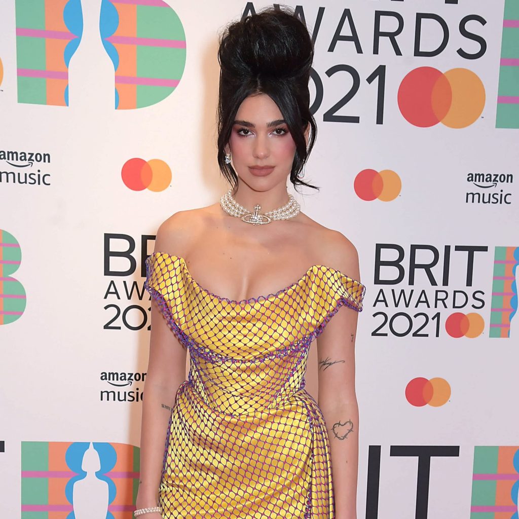 Dua Lipa is certainly one of the most stylish stars on the 2021 BRIT Awards red carpet. The Future Nostalgia singer arrived looking like a winner wearing a golden-yellow Vivienne Westwood minidress with head-to-toe accessories by the iconic British punk fashion brand.
